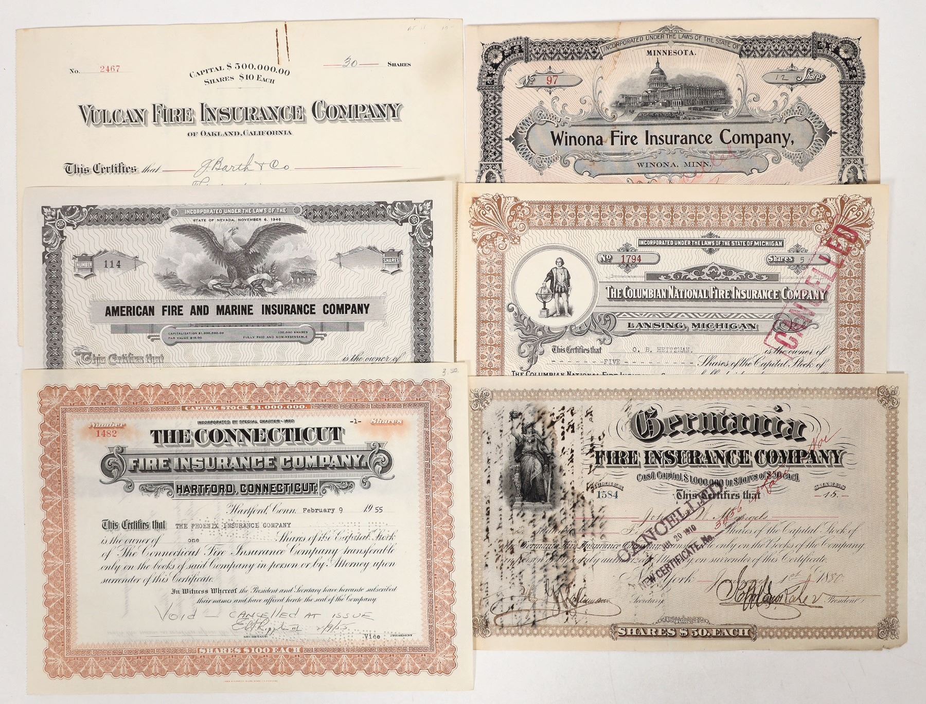 A group of 6 stock certificates from various fire insurance companies, dating 1880 to 1955. These companies are the Germania Fire Insurance Co., Connecticut Fire Insurance Co., Columbian National Fire Insurance Co., Winona Fire Insurance Co., American Fire and Marine Insurance Co., and Vulcan Fire Insurance Company. Connecticut and American certificates are unissued. All issued certs are signed by secretary and president of their respective companies. Germania, Columbian, and Winona are cancelled. Generally good condition; water damage on Germania cert.