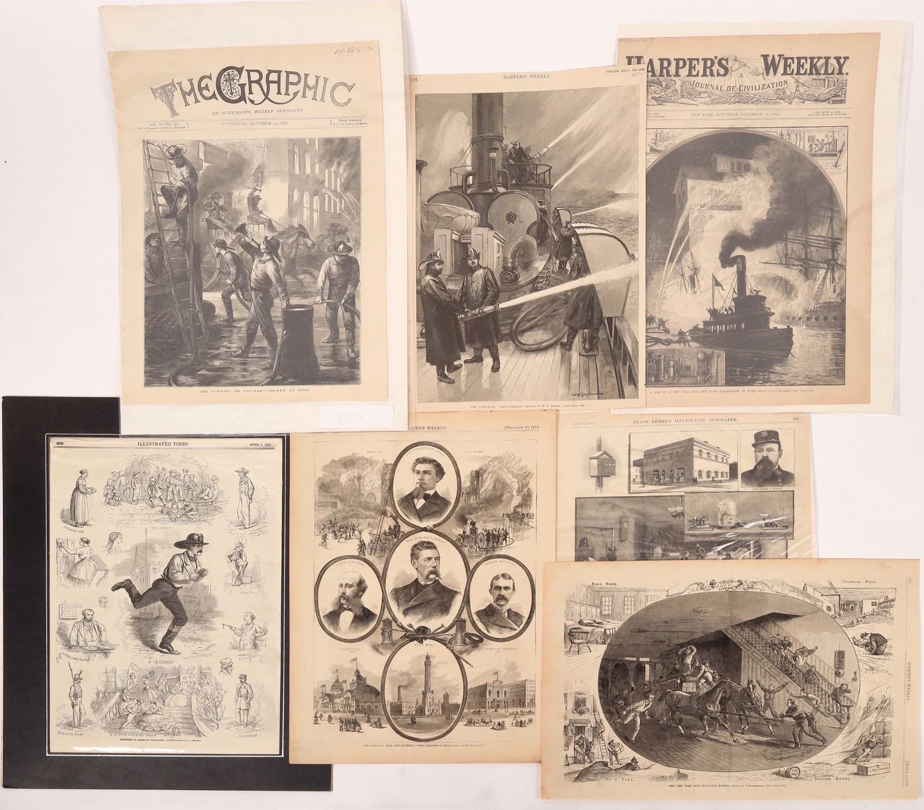 Fire Related Woodcut Prints from Early Journals (7). 1) "A Fire at a New York Dock - The River Fire Brigade at Work", Harper's Weekly, November 11, 1882. 2) The Fireboat "New Yorker", Harper's Weekly, Feb. 2, 1891. 3) "The Burning of Chicago - Firemen at Work", The Graphic, October 21, 1871. 4) The New York Fire Ins. Patrol, Harper's Weekly, March 4, 1876. 5) "The Fire Dept. of Chicago, and it's Methods", Frank Leslie's Illustrated News, June 26th, 1886. 6) "The Chicago Fire Dept. December 19, 1874. 7) "Sketches from American Characters ", Illustrated Times", June 1, 1861.
