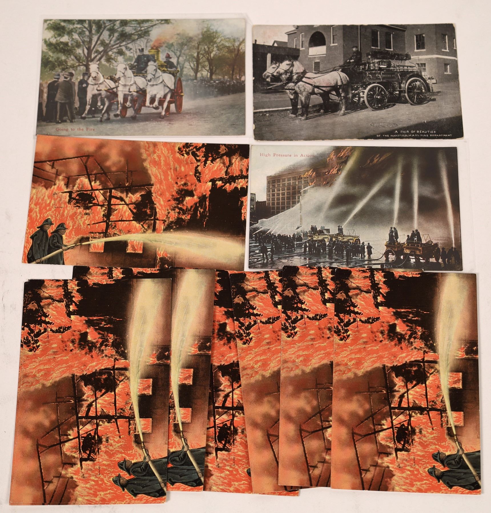 Eight postcards with the same design showing two firefighters in front of a building engulfed flaming orange fire; a color postcard with at least nine hoses trained on a burning building labeled High Pressure in Action; a color postcard of a team of three white horses pulling a fire wagon, and a black and white image of two horses pulling a fire wagon. This is one hot lot.