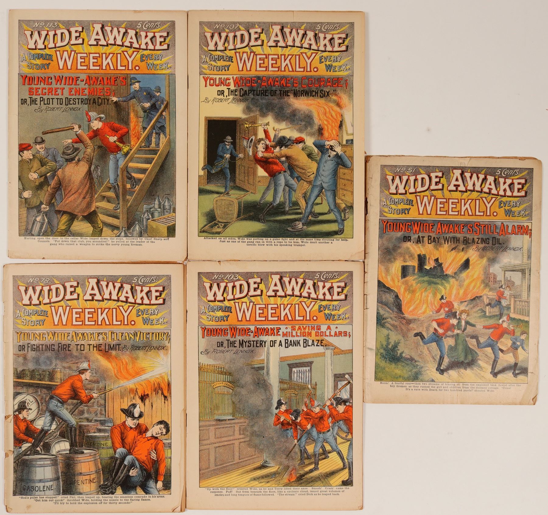Here we have a really great find. It is 5 different stories, of the adventures of boy firemen. Turn of the century , comic books!! Outstanding and exciting , multi colored covers , and thrills. No# 51: " At Bay With Blazing Oil",No. #78: " Fighting Fire To The Limit",No #103: " The Mystery Of A Bank Blaze", No #107: " The Capture Of The Norwich Six", and No. 113" The Plot To destroy A City". Great reading , and well written story lines. Very nice condition , with only a few edges browning and minor separations, here and there. After you have read them, would look great, framed and hung on the wall ( RH). City: State: New York Date: 19087-1908