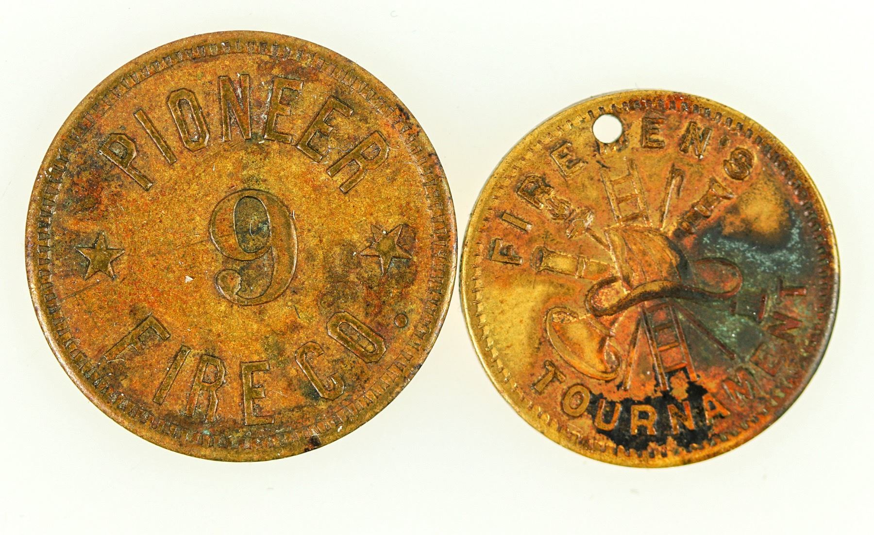 Two tokens related to firefighters: 1) pictorial fire wagon / Firemen's / Tournament / (helmet, hose, ladder); Br., rd, 18 mm, holed. 2) Pioneer / 9 / Fire Co. // 10; Br., rd, 20 mm.
