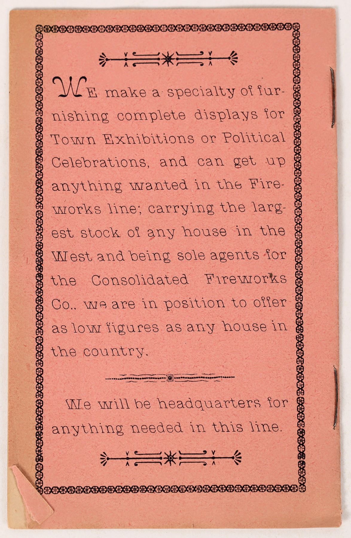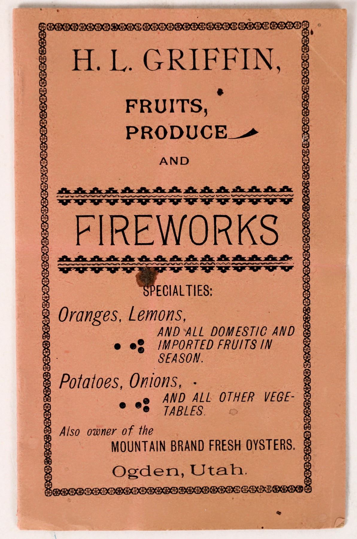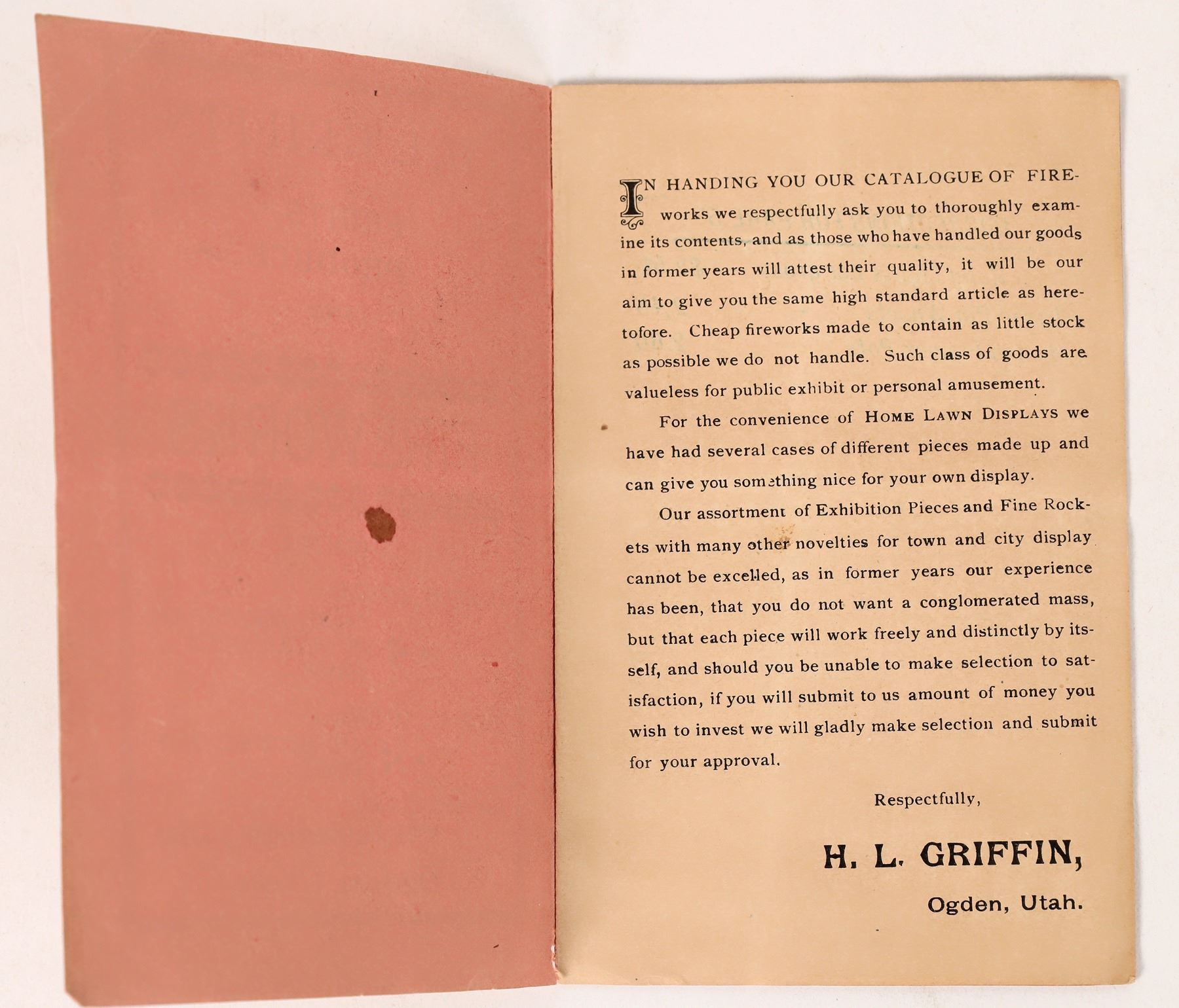 RARE Fireworks catalog from Buford archive of Virginia City, Montana from around 1885. The booklet is put out by H.L. Griffin of Ogden, Utah who also advertises fruits and other produce, although there's no listing in the book. In nice condition. Please see photos for more details. Utah Ogden 1885