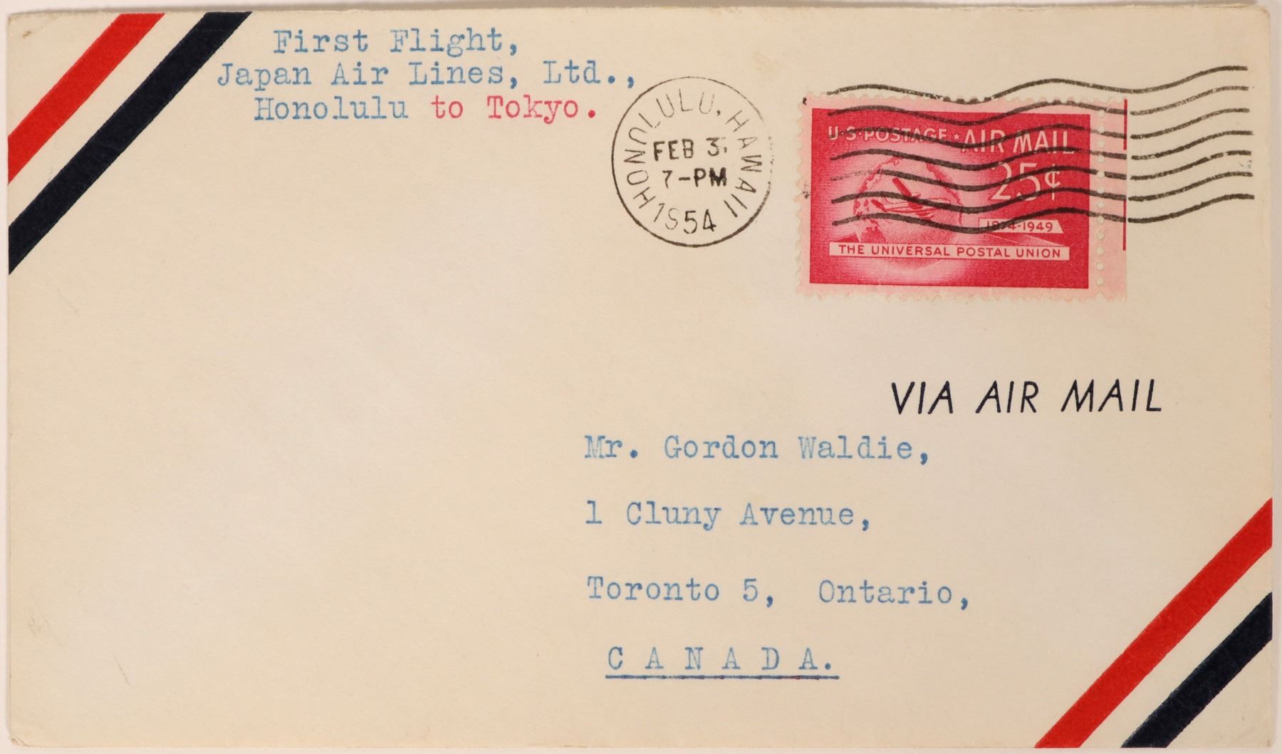 A first flight cover from Honolulu, Hawaii to Tokyo, Japan, February 3, 1954. Has a Tokyo AMF, Japan postmark and small cachet on the back.