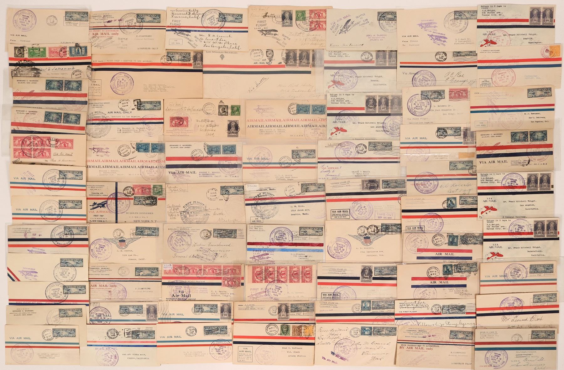 More than 60 first flight contract air mail service covers for routes from Los Angeles to Seattle in 1926, some by way of Portland and Medford, Oregon, as shown by Sept. 15, 1926 postmarks. Interesting lot containing many special stamps such as First Flight Medford Crater Lake National Park and 'Special Flight Sacramento to San Francisco, Sept. 14, 1926. Covers are canceled and in very good condition.