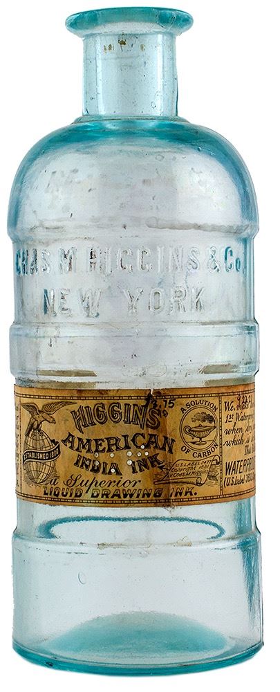 Aqua 7.5" tall "Chas. M. Higgins & Co., New York" "16oz" with original paper label in recessed band in the center. 3" diameter. This is thought to be the first, or one of the first, Higgins Ink bottle from about 1885. The company was founded in 1880. No chips, scratches, or discoloration. A gem for the ink collector. Used for the illustration of Higgins Ink in Holabird, Volume 1, p288. x-Holabird. City: State: New York Inventory Number: 39533