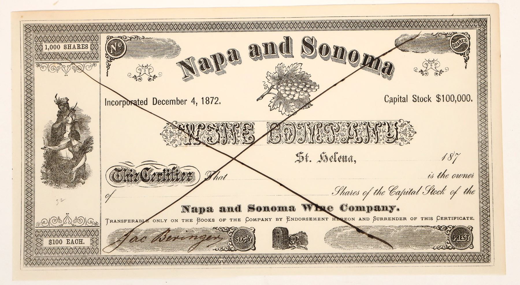 A stock certificate from Napa County, California's first public wine company, Napa and Sonoma Wine Company, St. Helena, 187X. Signed by J. Beringer, as secretary. No president's signature. Wine grape vignette, 1,000 shares, unissued, incorporated Dec. 4, 1872. Jacob Beringer, along with his brother Frederick, founded Beringer Vineyards in 1876 in St. Helena, California. Beringer Vineyards is California's longest continuously operating winery, and is still in operation today.