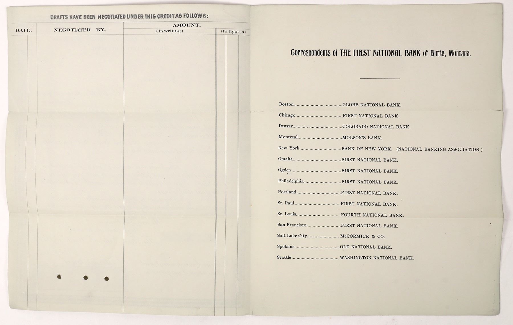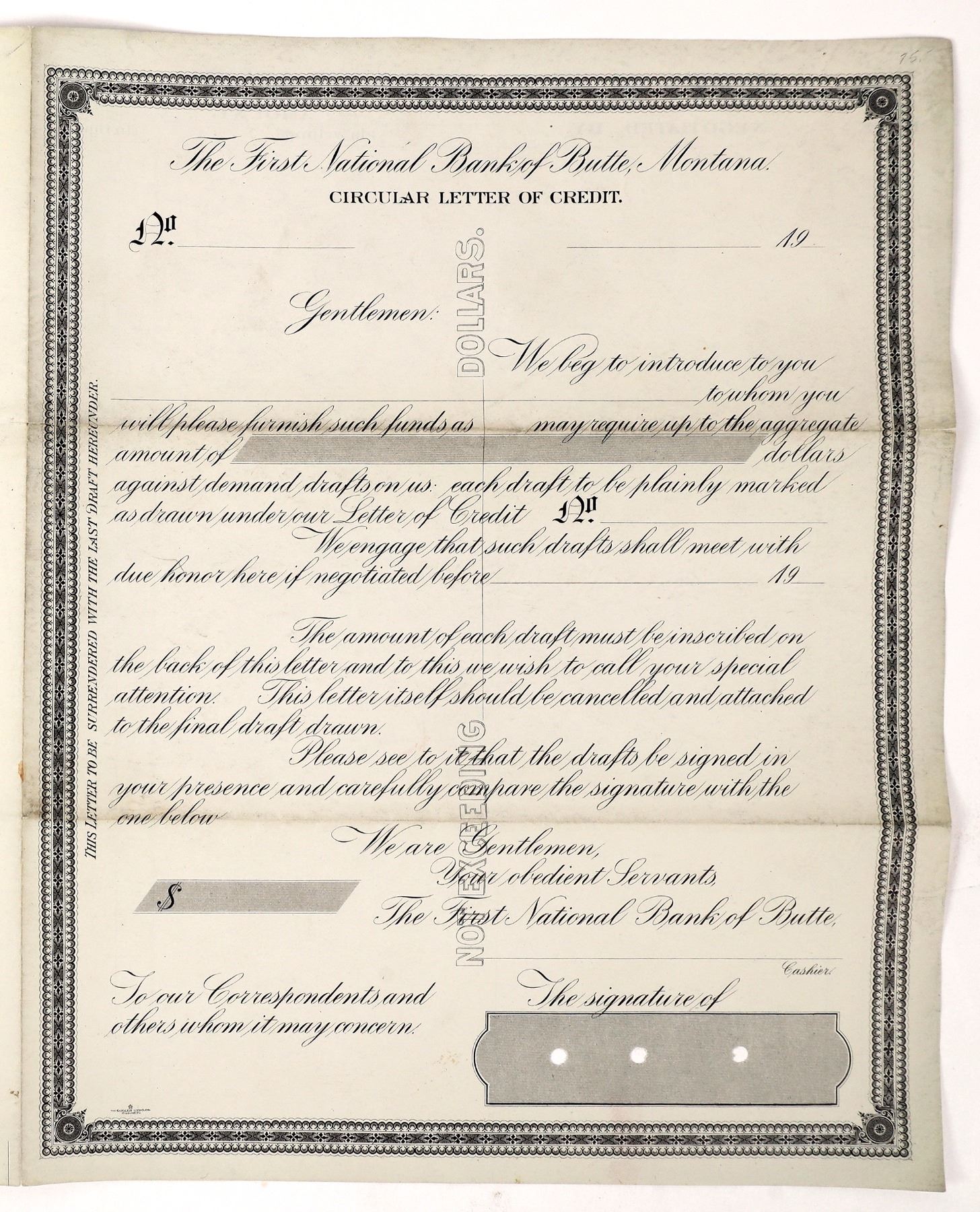 Rare 4pp First National Bank of Butte printers proof unissued credit letter. c. 1900's. .5" crease tear. Montana Butte
