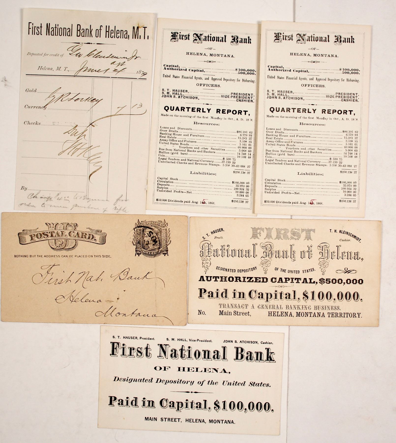 Lot of 6. The First National Bank of Helena, Montana, was organized by Samuel T. Hauser and TH Kleinschmidt in 1866. The bank erected its own building in 1866 at the corner of Main and Wall streets, near where Helena's first gold strike had been made two years before. This group includes: four advertising cards/quarterly reports printed on cardstock, 1866-1868, one duplicate; 1879 deposit slip for currency; and an 1882 postcard sent to the bank from Billings. Date: 1866-1882 City: Helena State: Montana HWAC# 77515
