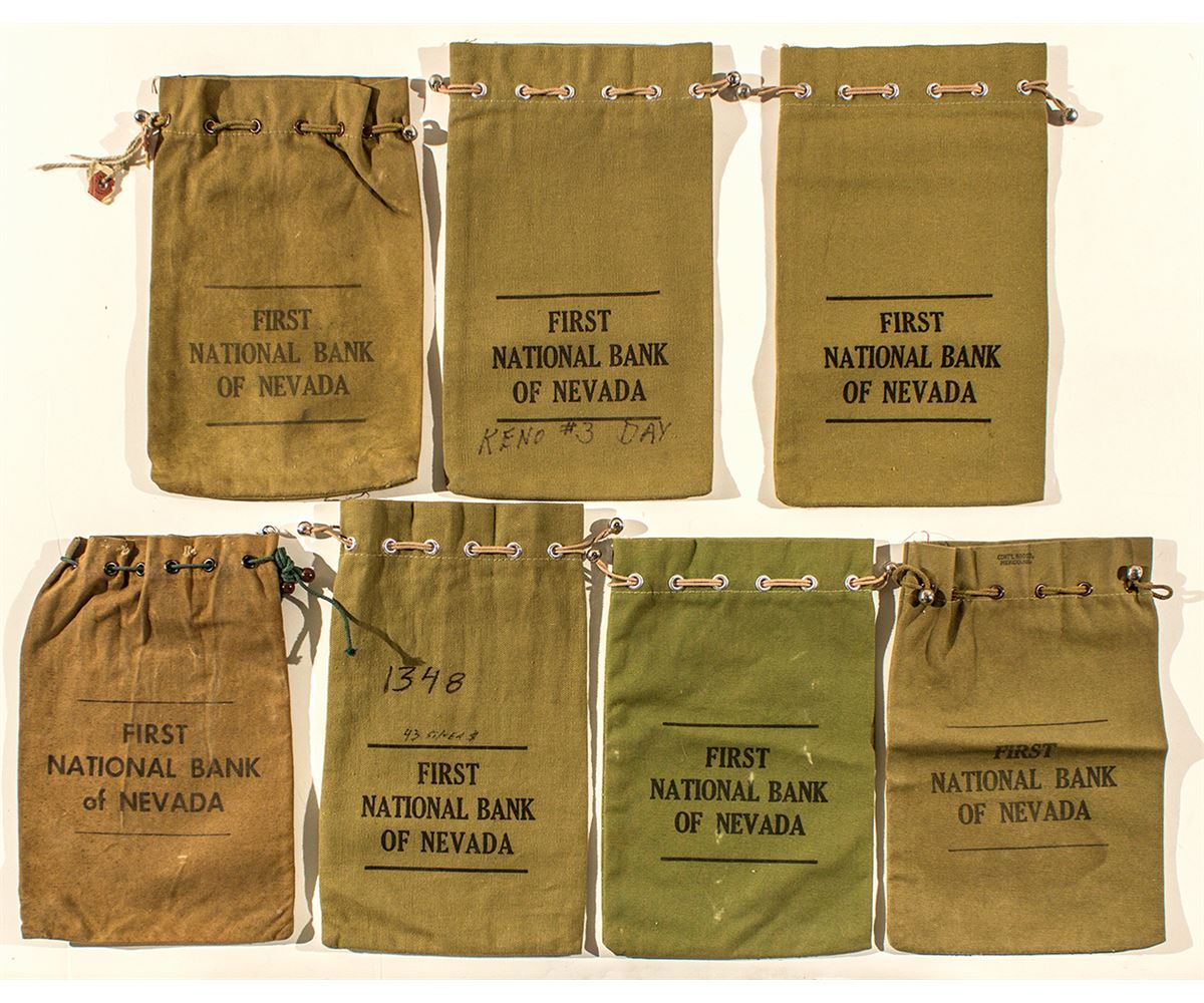 Lot of 7 canvas bags from the First National Bank of Nevada, 6 x 10" green.