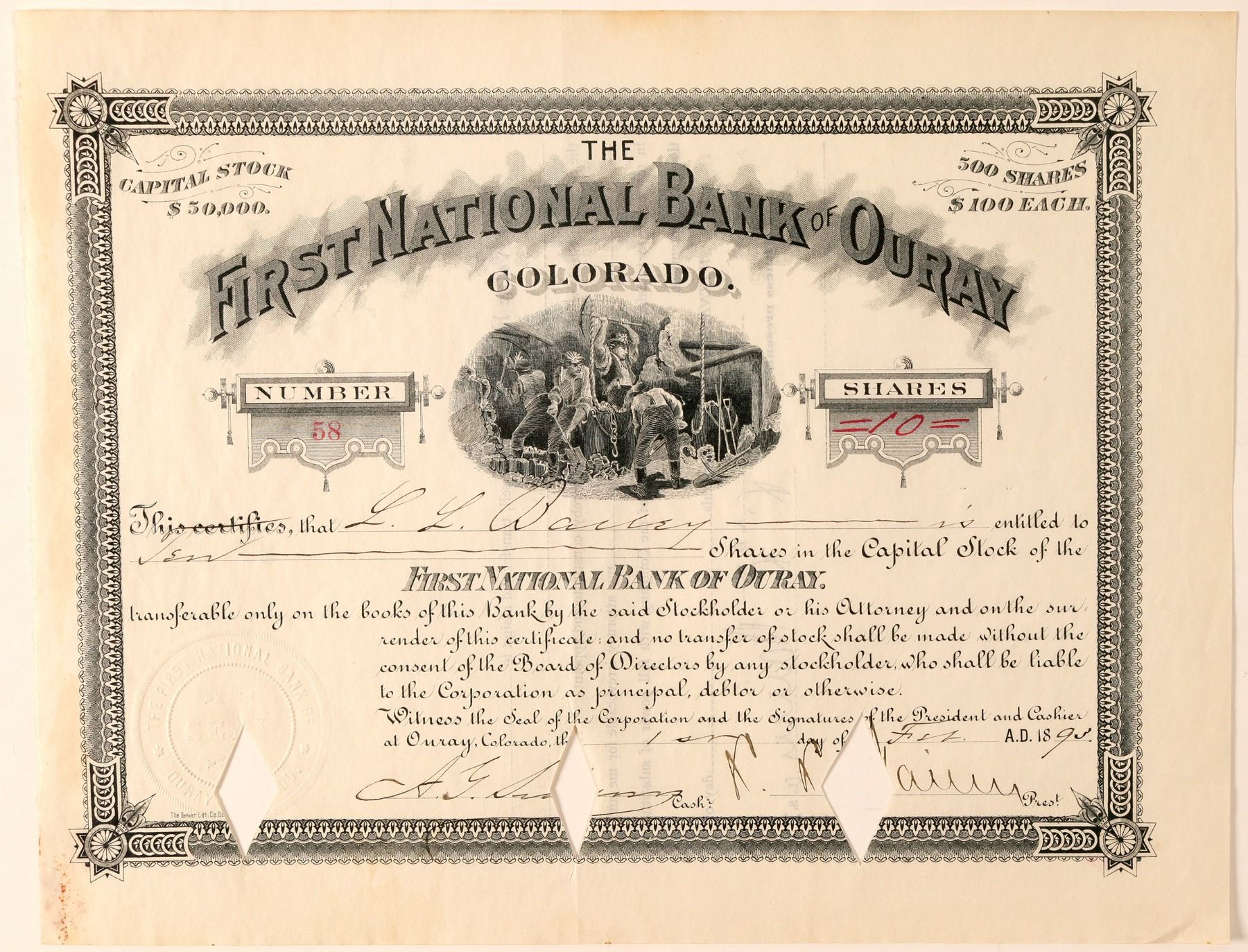 Wow! Dateline Ouray, Colorado, Feb. 1st, 1893. No. 58, issued for 10 shares to L.L. Bailey. Signed by the president and cashier; signatures are partially cut cancelled. Black border and print. Shaded logo and vignette of miners filling an ore bucket. Printed by the Denver Lith. Co. 8.5 x 11" The bank began business in Sept. 1889 and suspended operation July 1st, 1893, less than six months after this stock was issued, during the 1893 Silver Crisis. When it reopened, it was named Bank of Ouray. It filed for bankruptcy in 1907. () Ken Prag Collection
