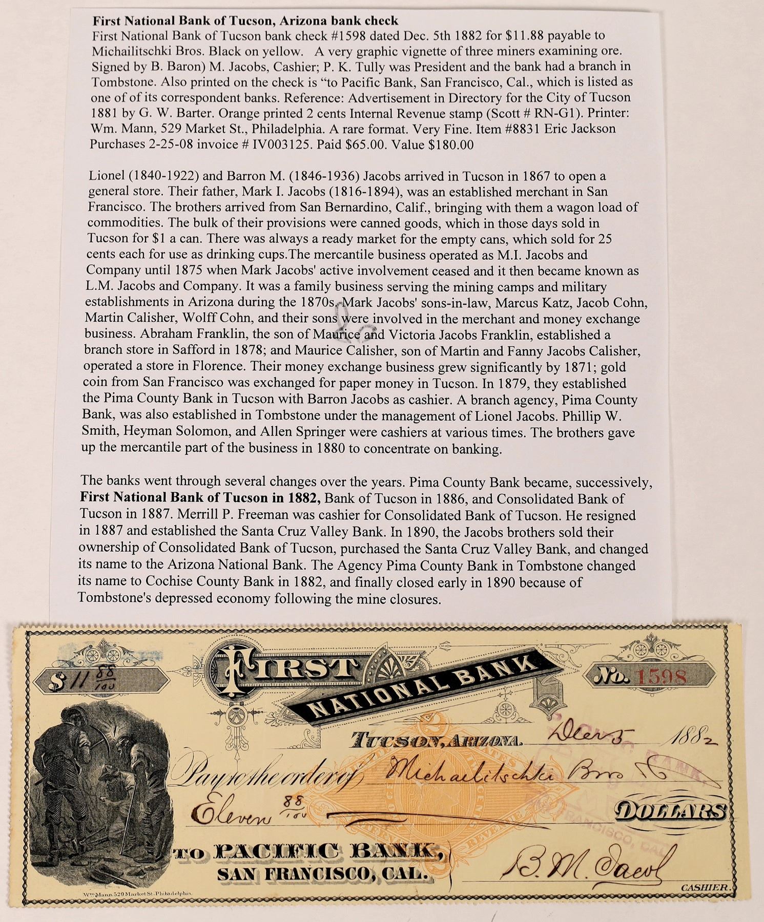 First National Bank of Tucson bank check #1598 dated Dec. 5th 1882 for $11.88 payable to Michailitschki Bros. Black on yellow. A very graphic vignette of three miners examining ore. Signed by B. M. Jacobs, Cashier; P. K. Tully was President and the bank had a branch in Tombstone. Also printed on the check is "to Pacific Bank, San Francisco, Cal., which is listed as one of of its correspondent banks. [City Directory, Tucson 1881] Orange printed 2 cents Internal Revenue stamp (Scott# RN-G1 ). A rare format. Very Fine. Lionel and Barron M. Jacobs arrived in Tucson in 1867 to open a general store. In 1879, they established the Pima County Bank in Tucson with Barron Jacobs as cashier. Pima County Bank became the First National Bank of Tucson in 1882. Sold by Jacobs brothers1890. One page history included.