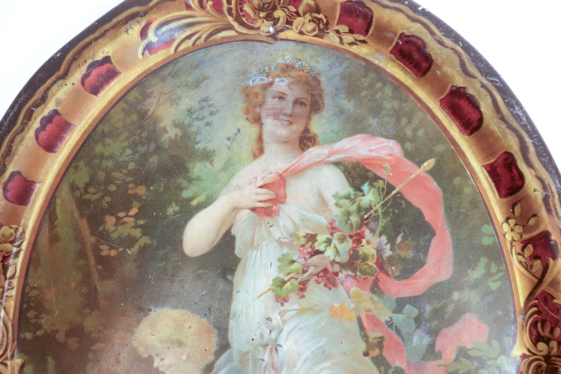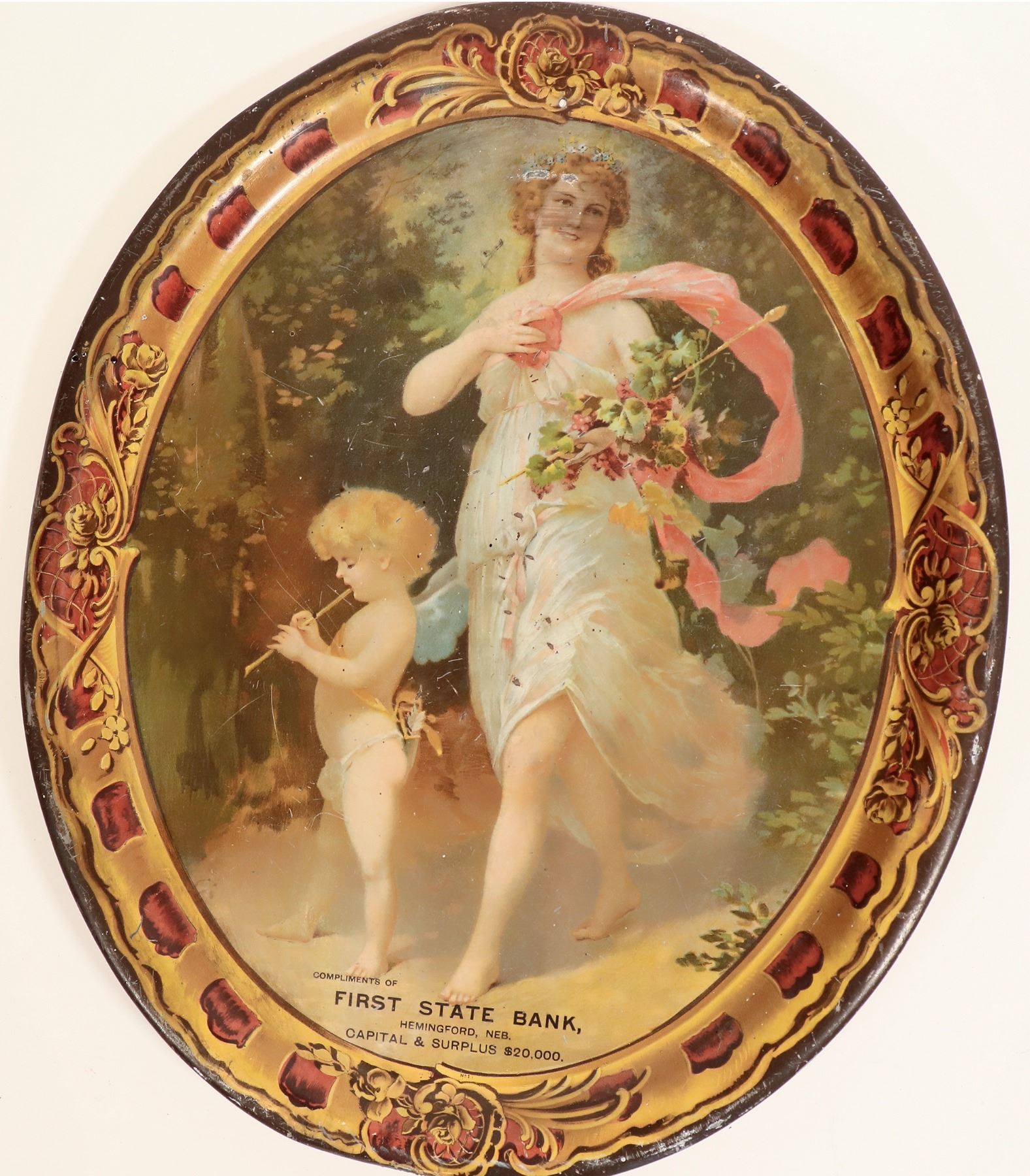 This oval beer tray measures 13.5 in. X 16.5 in. and depicts a woman with a cherub playing the flute. The base has a number of small dents and a hole drilled at the top for hanging. Scuffs and loss of paint. "Compliments of First State Bank/Hemingford, Neb./ capital & surplus $20,000". Condition fair. Nebraska