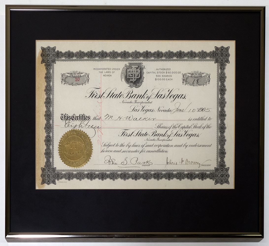Rare. Framed and matted. Inc. in Nevada. No. 10. Issued for 18 shares to M.H. Walker on June 10, 1905. Signed by Chris Brown (president) and John S. Park (cashier). No vignette. Gold corporate seal. Ornate border. Printed by Los Angeles Litho. Co. Toning (or glue leftover?) on left side and folds. The First State Bank, originally a wood structure, was located at the corner of First and Fremont Streets. This Las Vegas branch of the statewide banking system was integral in the growth of Las Vegas. Park was an early Vegas pioneer. Brown was also manager of the Las Vegas Improvement Co., which sold plots early on. This stock is a direct connection to the beginning of Las Vegas.
