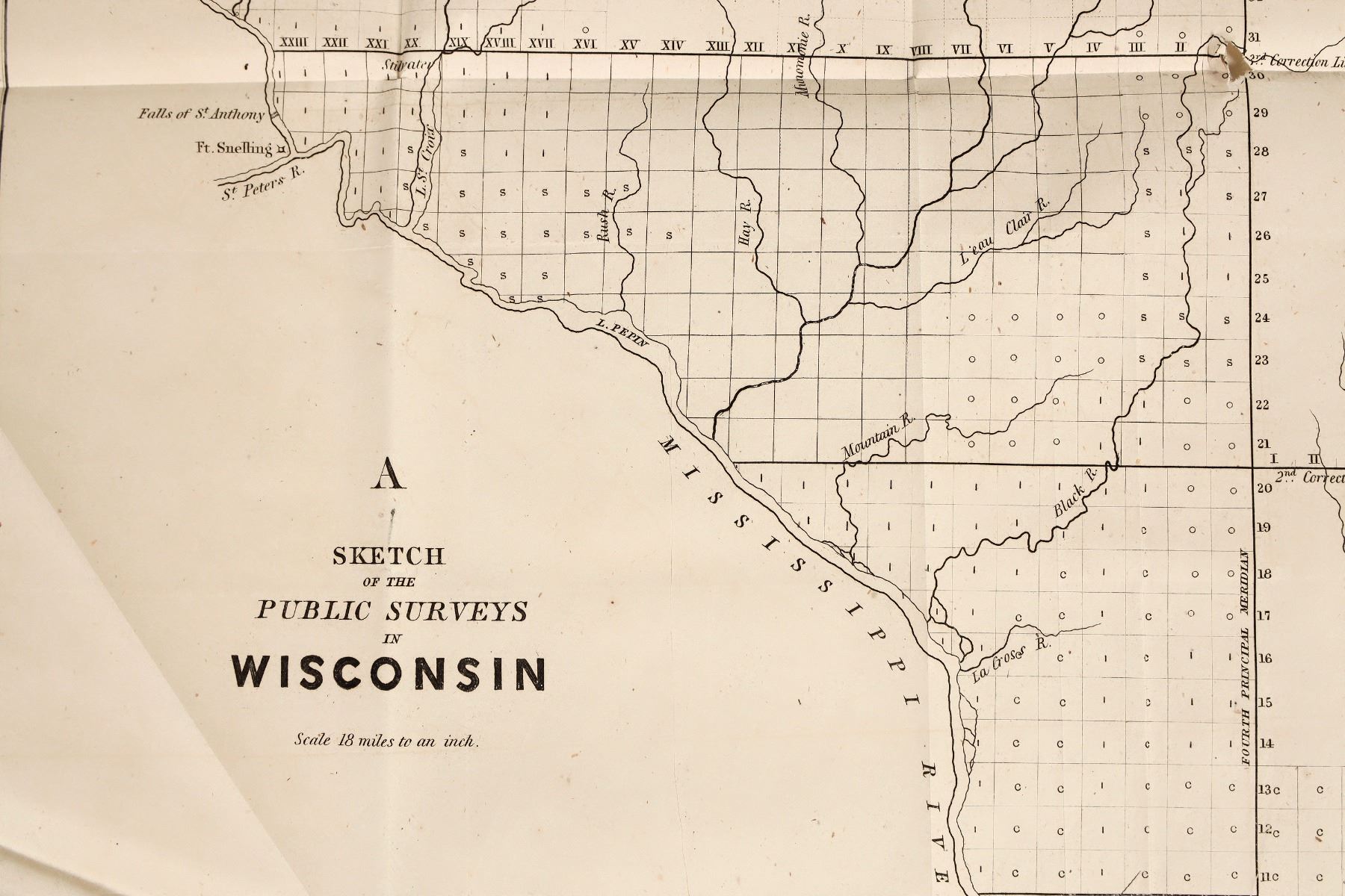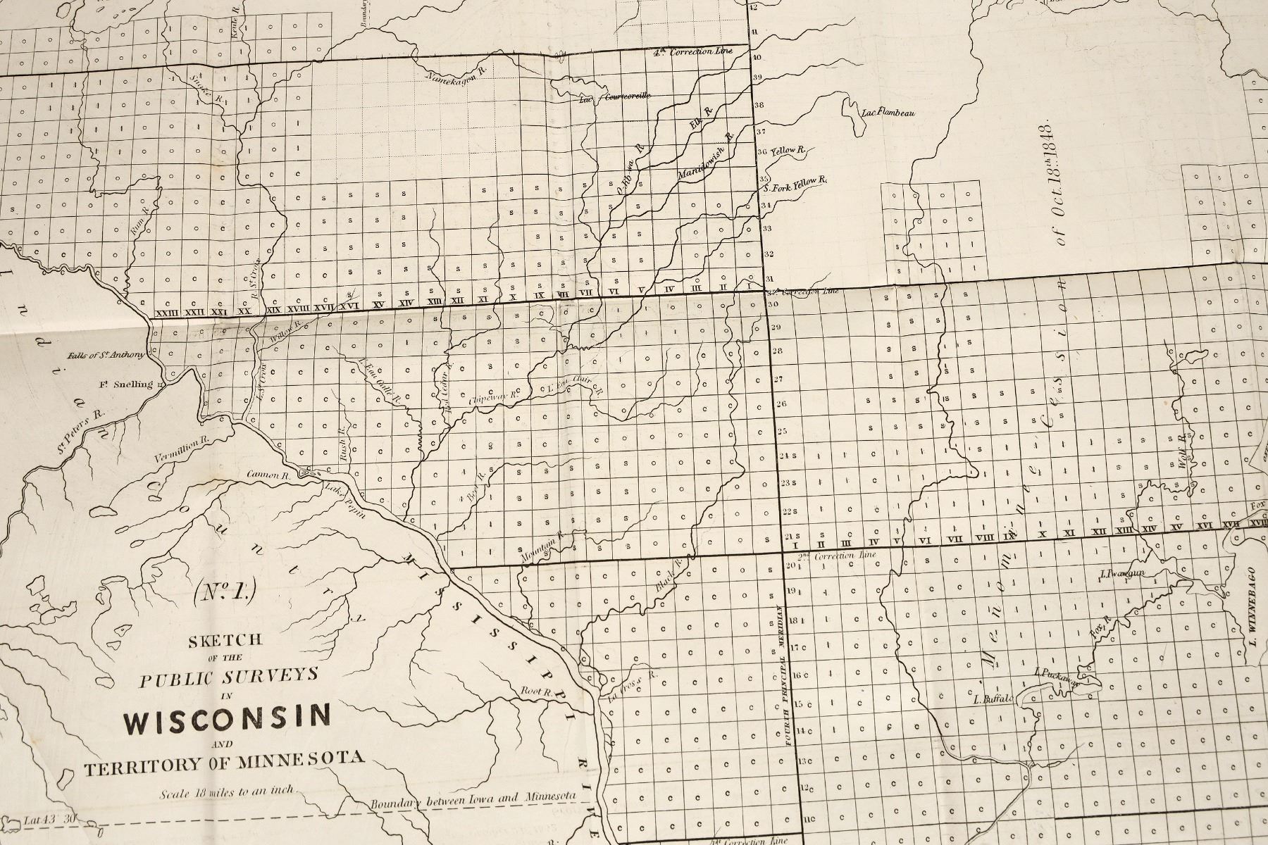 This lot contains three maps from the General Land Office for the territories of Wisconsin and Minnesota, also covering a part of Michigan for the years 1848, 1850 and 1852. Through the succession of these three maps, one can start to understand the history behind the movement of western society into this region. The region was first "held" by the French, then by the British in the late 1700s, then by the Americans. Western movement advanced with the discoveries of rich copper deposits, a necessary ingredient of the industrial revolution. This group may contain the very first published "survey" map of Wisconsin from 1848. The story of the creation of this map is nothing short of amazing.