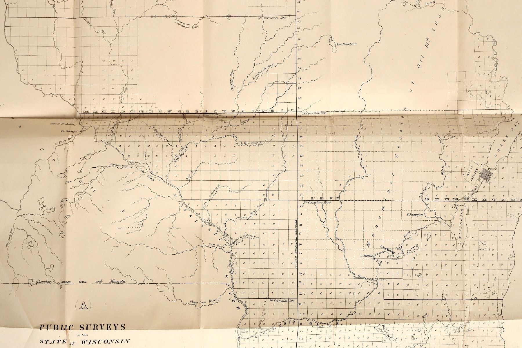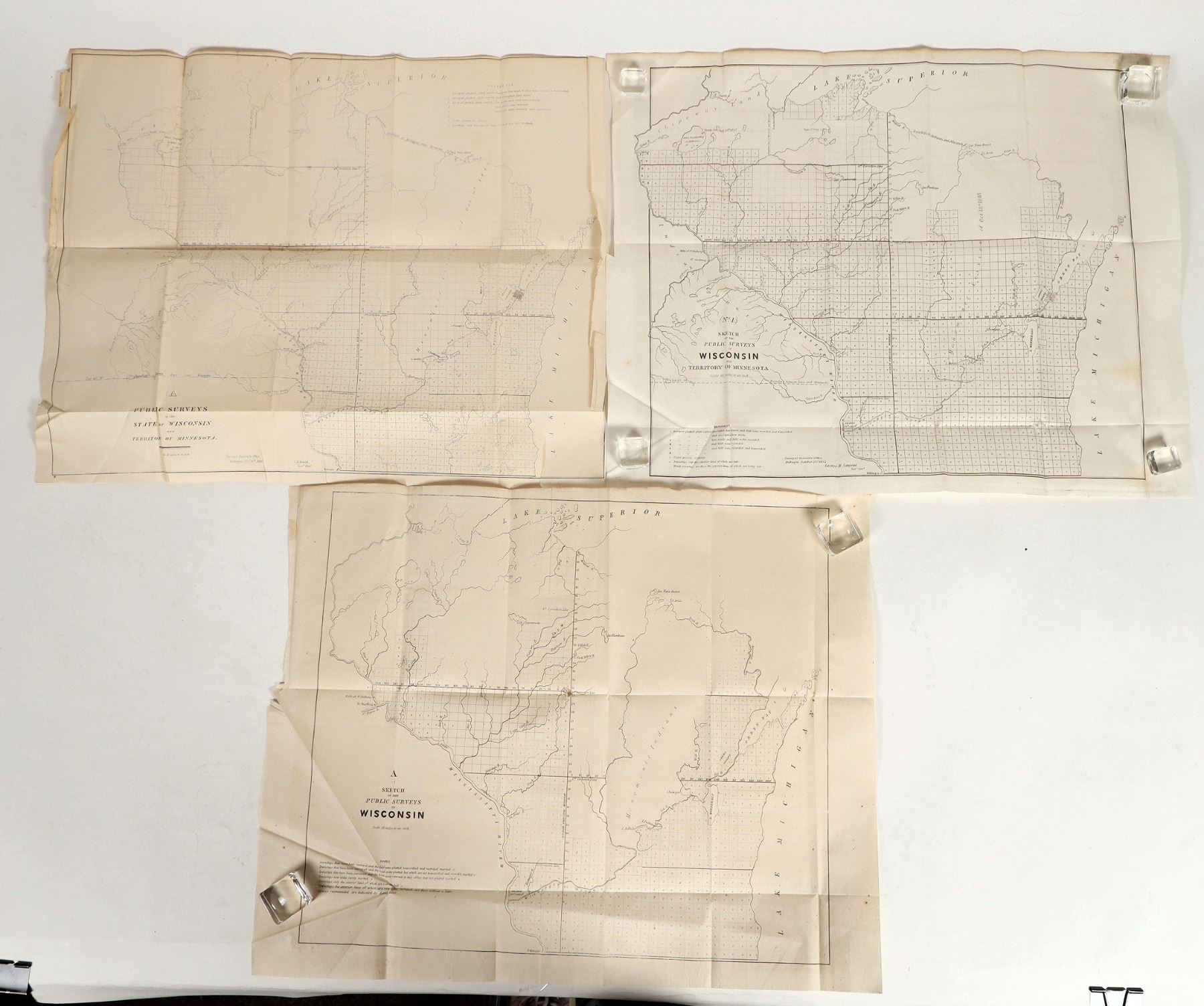 This lot contains three maps from the General Land Office for the territories of Wisconsin and Minnesota, also covering a part of Michigan for the years 1848, 1850 and 1852. Through the succession of these three maps, one can start to understand the history behind the movement of western society into this region. The region was first "held" by the French, then by the British in the late 1700s, then by the Americans. Western movement advanced with the discoveries of rich copper deposits, a necessary ingredient of the industrial revolution. This group may contain the very first published "survey" map of Wisconsin from 1848. The story of the creation of this map is nothing short of amazing._x000D_