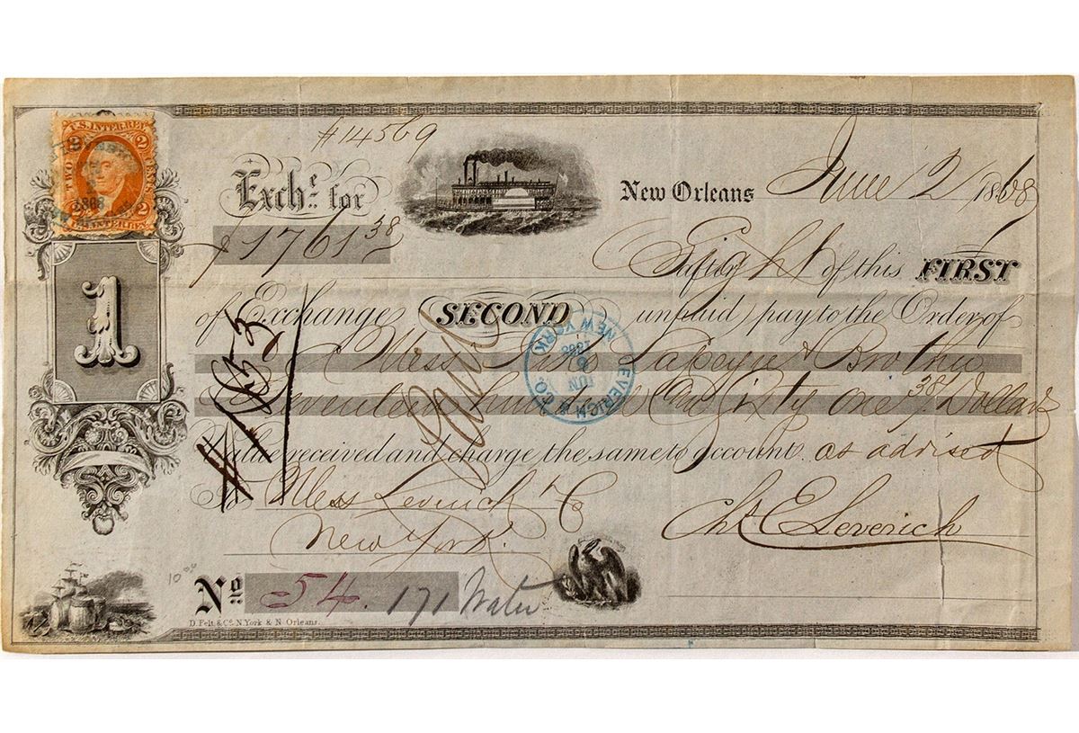 Leverich & Co. New Orleans, June 2, 1868. Printed by D. Felt & Co. Small steamboat vignette top center. Adhesive revenue stamp attached with tied cancel. Light soiling, creases and large tape repairs of tears. Measures 4.5" x 8.75" (Prag Collection)