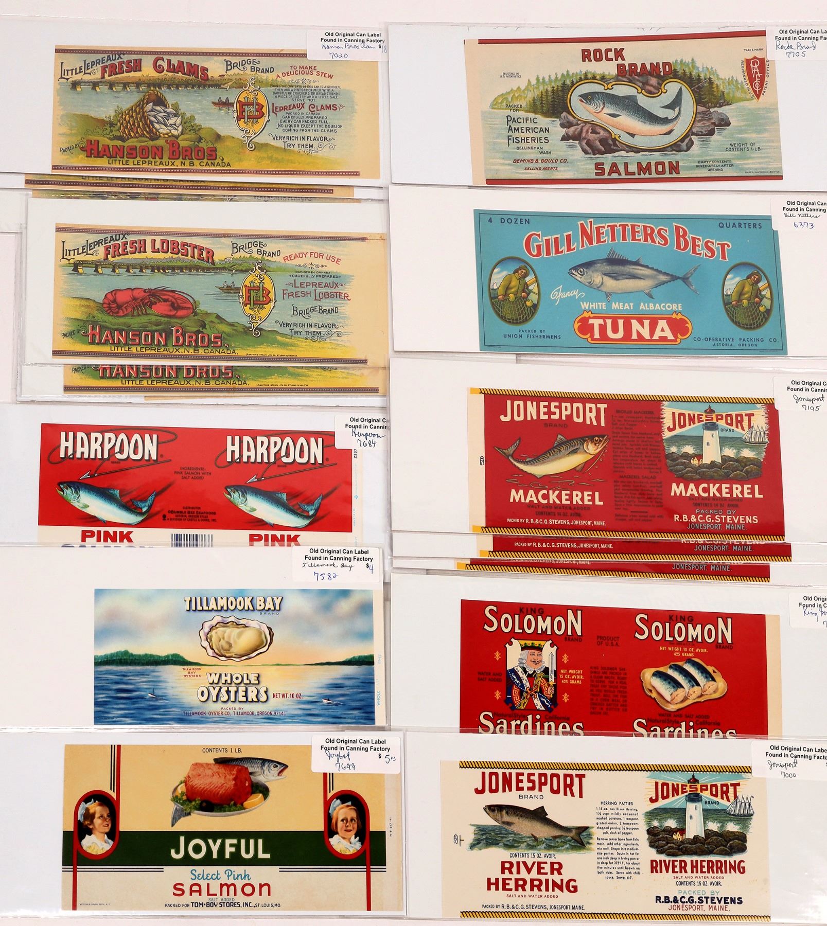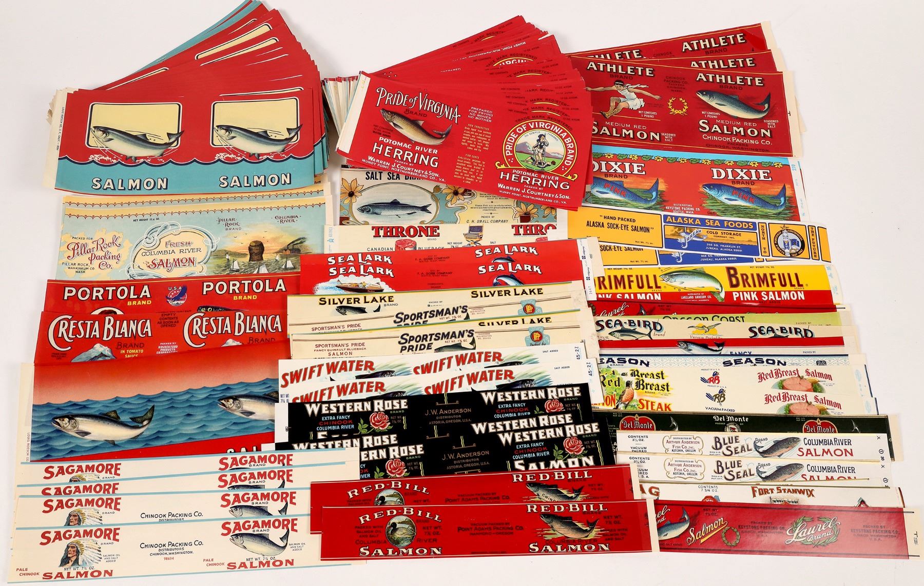 About 400 fish can labels. Athlete, Salmon, Pride of Virginia, Oysters, Lobster, Mackerel, Salmon. 4.5x10".