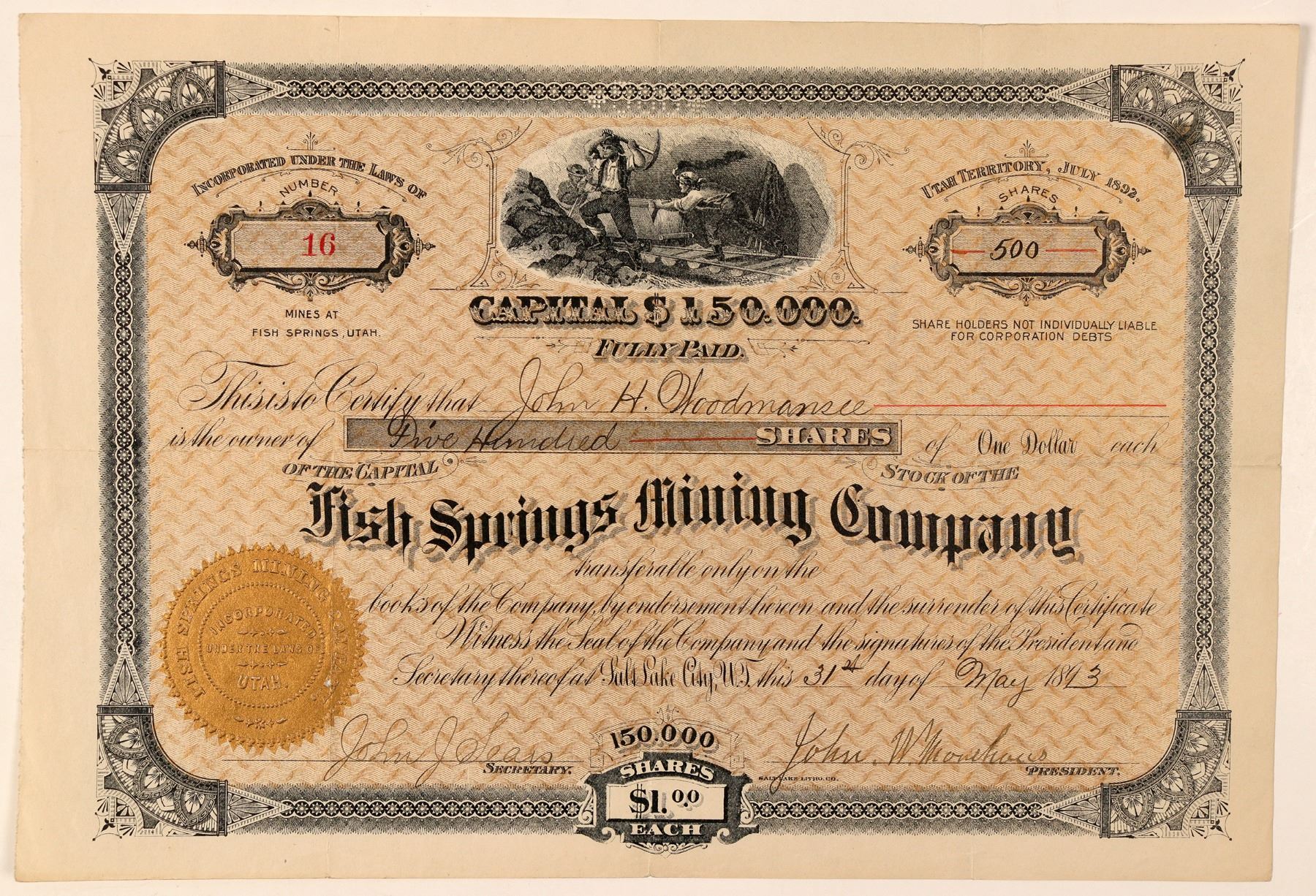 Mines at Fish Springs, Utah (printed upper left). Inc. in Utah Territory, July 1892. No. 16, issued for 500 shares to John H. Woodmansee on May 31st, 1893 in SLC. Signed by president and secretary (John J. Sears). Not cancelled. Black border and print, gold seal. Brown background, mining vignette. Printed by Salt Lake Litho Co. Deep horizontal and vertical folds, other light wear. 7.75 x 11.5" The Fish Springs District was in Juab County. Significant mines in the district included the Galena, Carbonate, and Utah. Ken Prag Collection