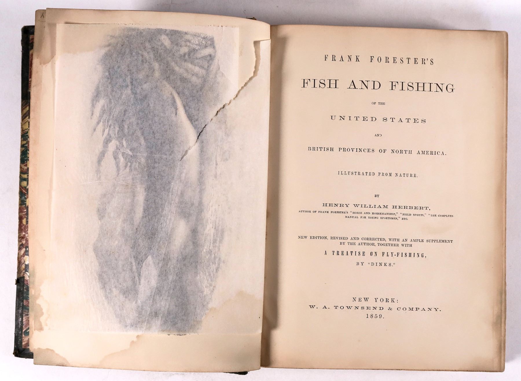 Rare 1859 Fish and Fishing by Frank Foresters, related to United States and British provinces of North America fish and of course fishing. 512pp with index and fish and gear plates. Light staining, some board wear, please inspect.