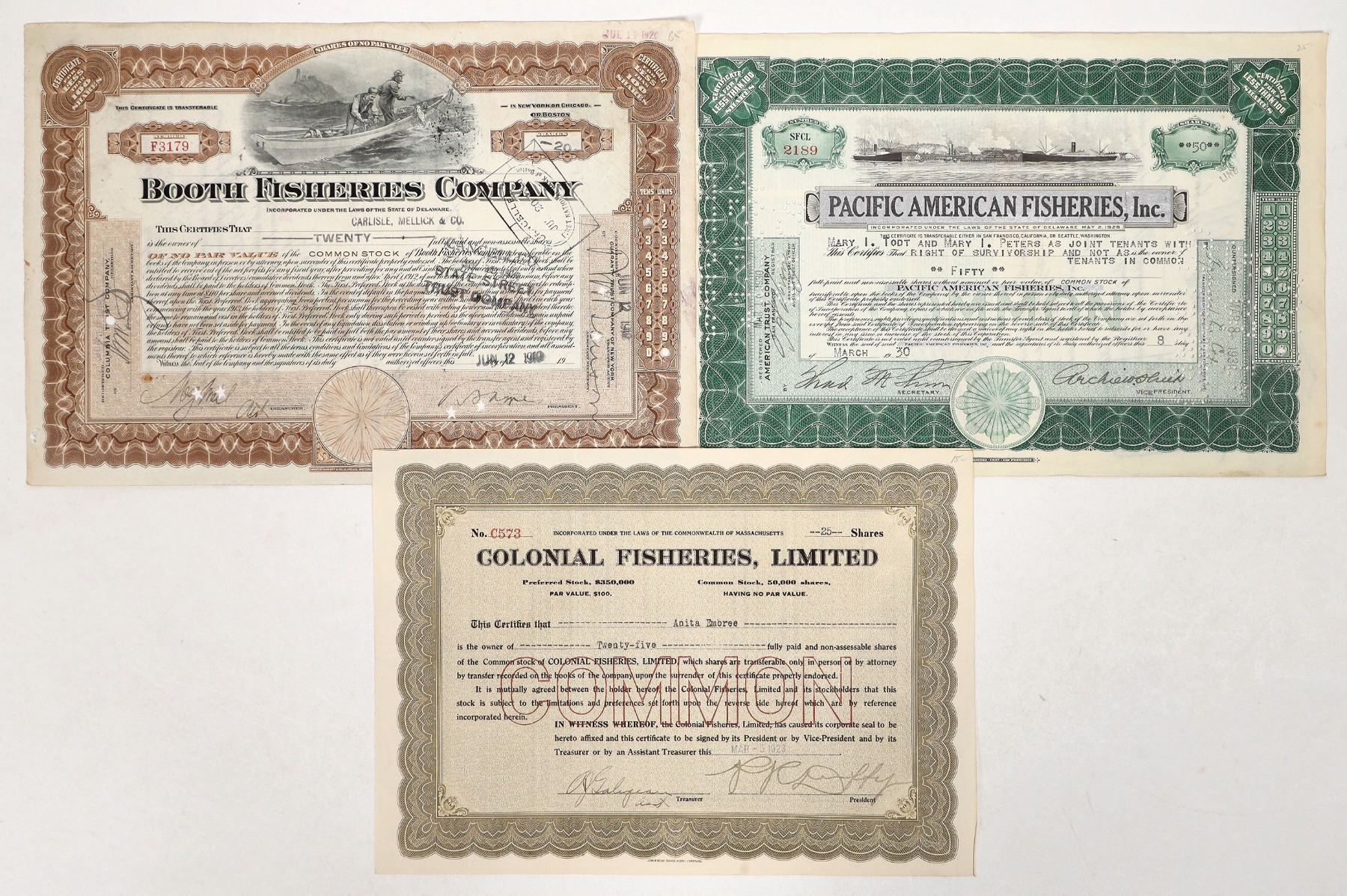 A group of 3 stock certificates, dated 1919-1930, from three fisheries companies: Booth Fisheries Company, Pacific American Fisheries Inc., and Colonial Fisheries Limited. All are issued; each is signed by president/VP and treasurer/secretary with an embossed seal. Booth and Pacific American certs are cancelled. Two certs have vignettes, including one dramatic fishing scene. Varying condition; see photos for extent of toning/staining.