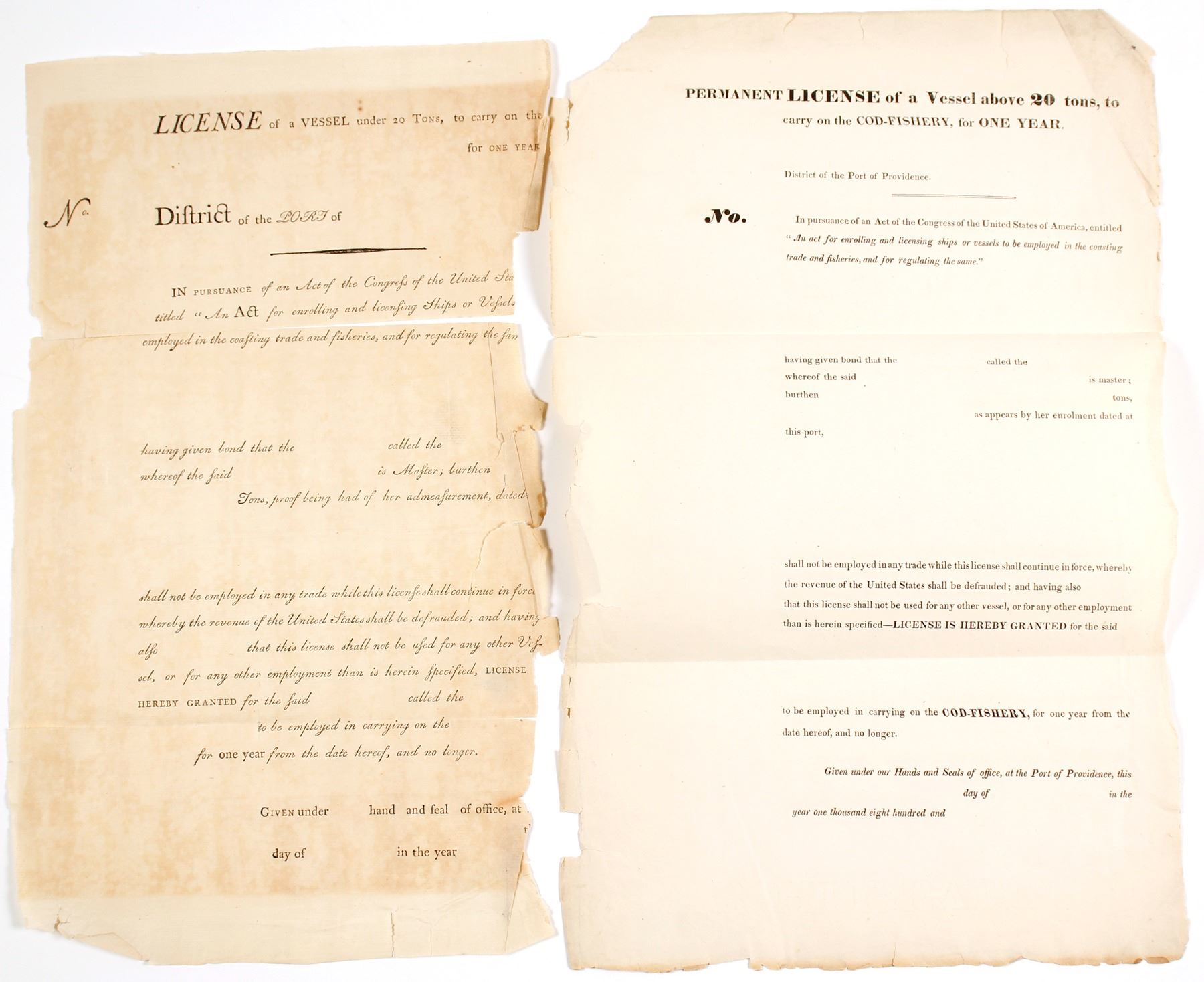 Fishing License of Vessel Above 20 Tons Lot of 2 Fishing Licenses from 1800's to carry on the Cod-Fishery for one year. Some condition issues (tearing at right side of License that encroaches on print) 1800s