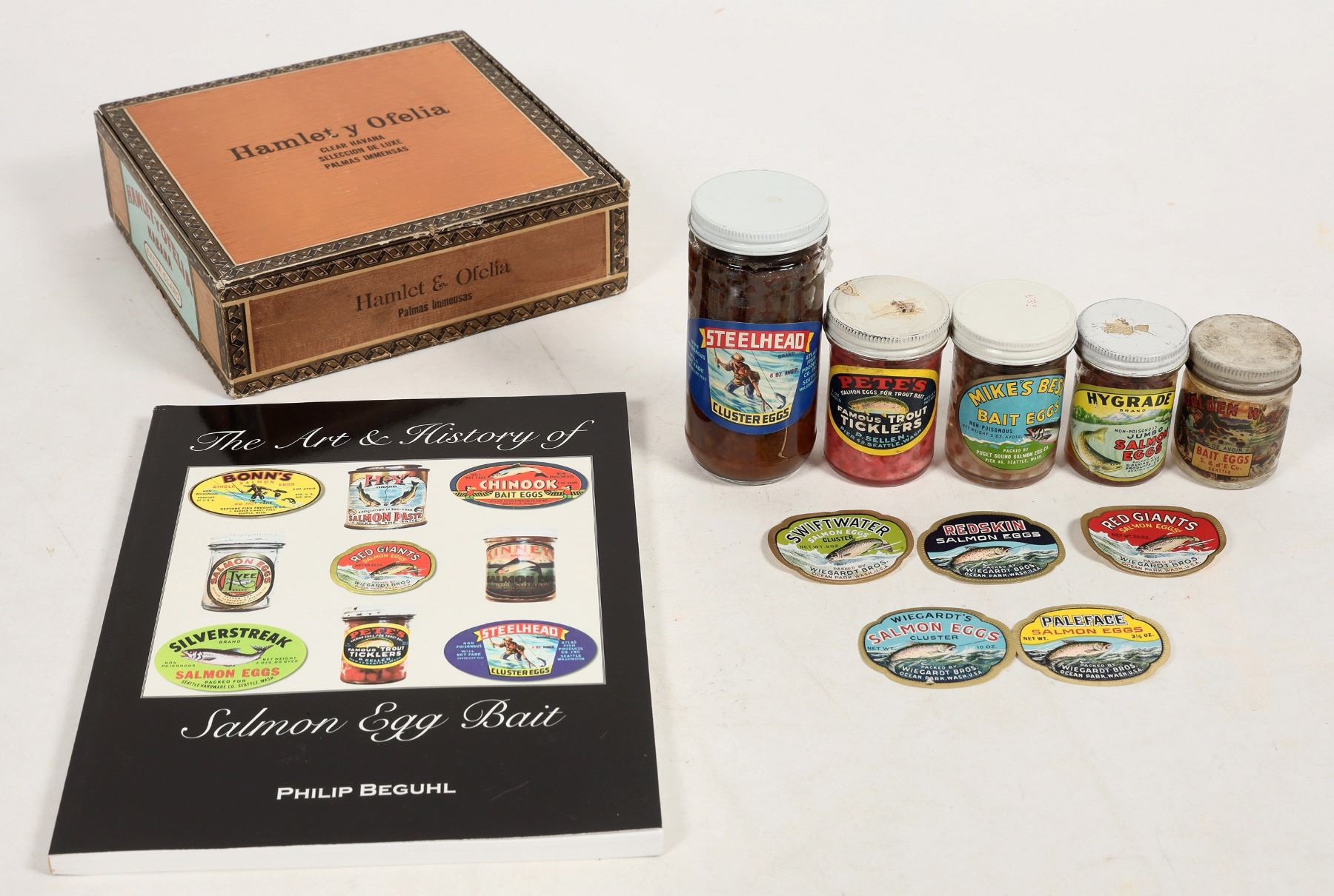 Lot of 11. 1) The Art & History of Salmon Egg Bait by Philip Beguhl. 2010. 141 pp. Full of colorful illustrations and pictures. A topic that is central to the history of the Pacific Northwest and sport fishing! Nice copy. 2) Five different stone color lithograph salmon egg jar labels, circa 1930s. Wiegardt Bros., Ocean Park, Washington. Approx. 2.5 x 2" 3) Five different vintage salmon egg bait jars with labels. Housed in a cigar box.Mikes Best, Pete's , Hygrade, Golden West, and Steelhead.
