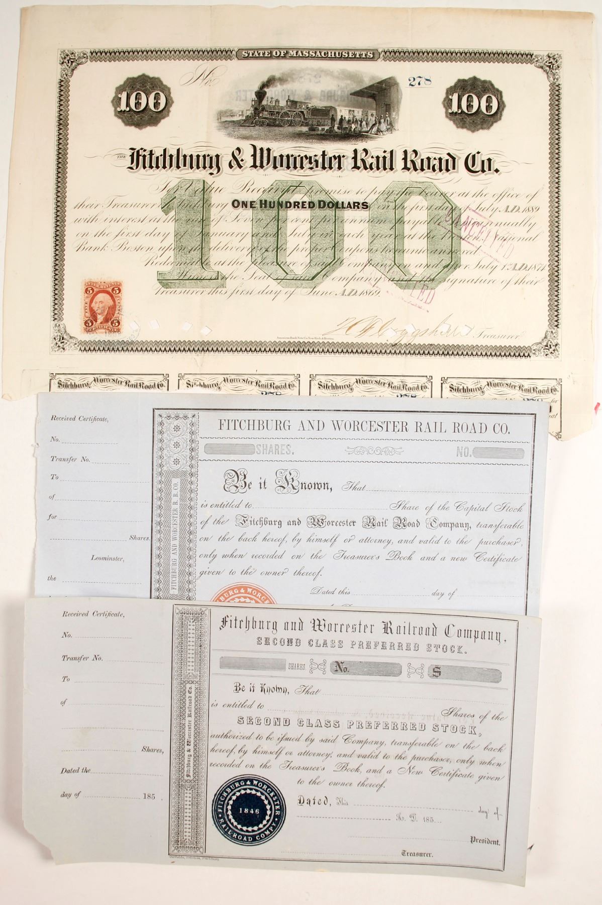 Non-issue stock for Fitchburg & Worrester Rail Road Company stock. 100 shares on certificate 278. The Fitchburg and Worcester Railroad was a railroad in Massachusetts. It was incorporated in 1840 to provide a rail connection between Fitchburg and Worcester. Service began on February 11, 1850, running 18 miles from Fitchburg through Leominster and Sterling to Sterling Junction, where it connected with the Worcester and Nashua Railroad.
