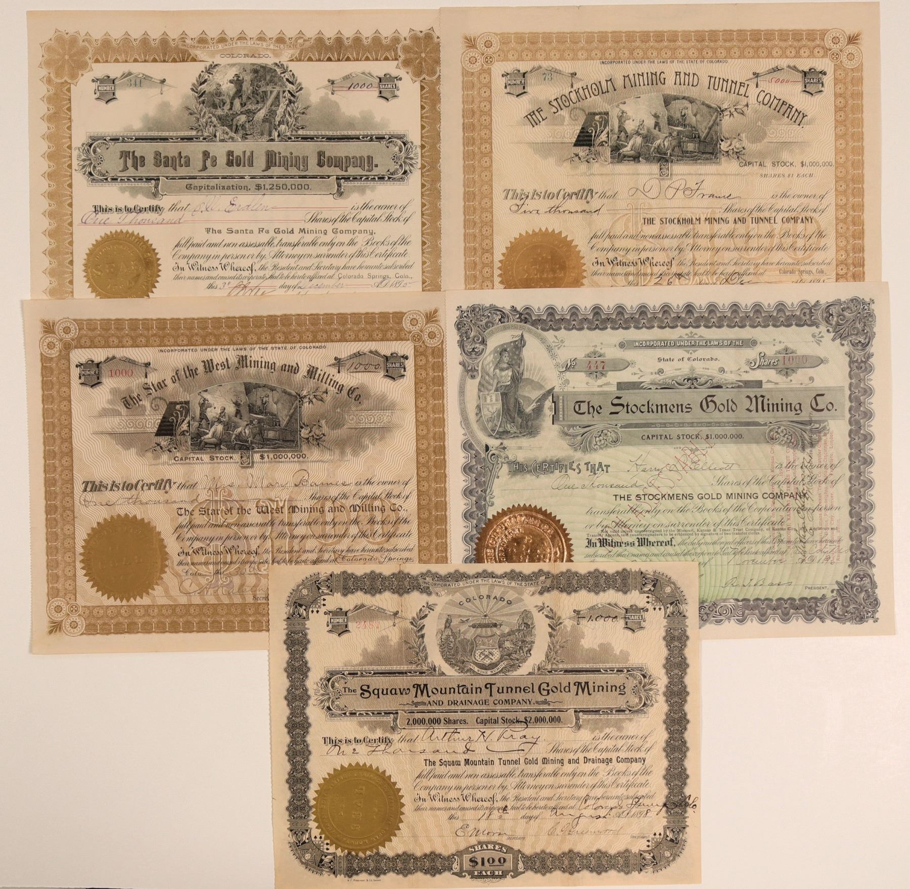 1) Santa Fe Gold Mining Company. Dateline Colorado Springs 1895. Underground mining vignette. They owned the E. A. H. on 10 acres of land on Big Bull Mountain. 2) Stockholm Mining Company. Dateline Colorado Springs 1895. Underground mining vignette. 3) Stockmens Gold Mining Company. Dateline Kansas City 1896. Attached gold seal. 4) Star of the West Mining and Milling Company. Dateline Colorado Springs 1896. NUMBER 1000 for 1000 shares. Located inthe Woody District. 5) Squaw Mountain Tunnel Gold Mining and Drainage Company. Dateline Colorado Springs 1898. Colorado seal vignette. Located on Squaw Mountain. Overall these certs are in very fine condition.  City: Cripple Creek  State: Colorado  Date: 1890's