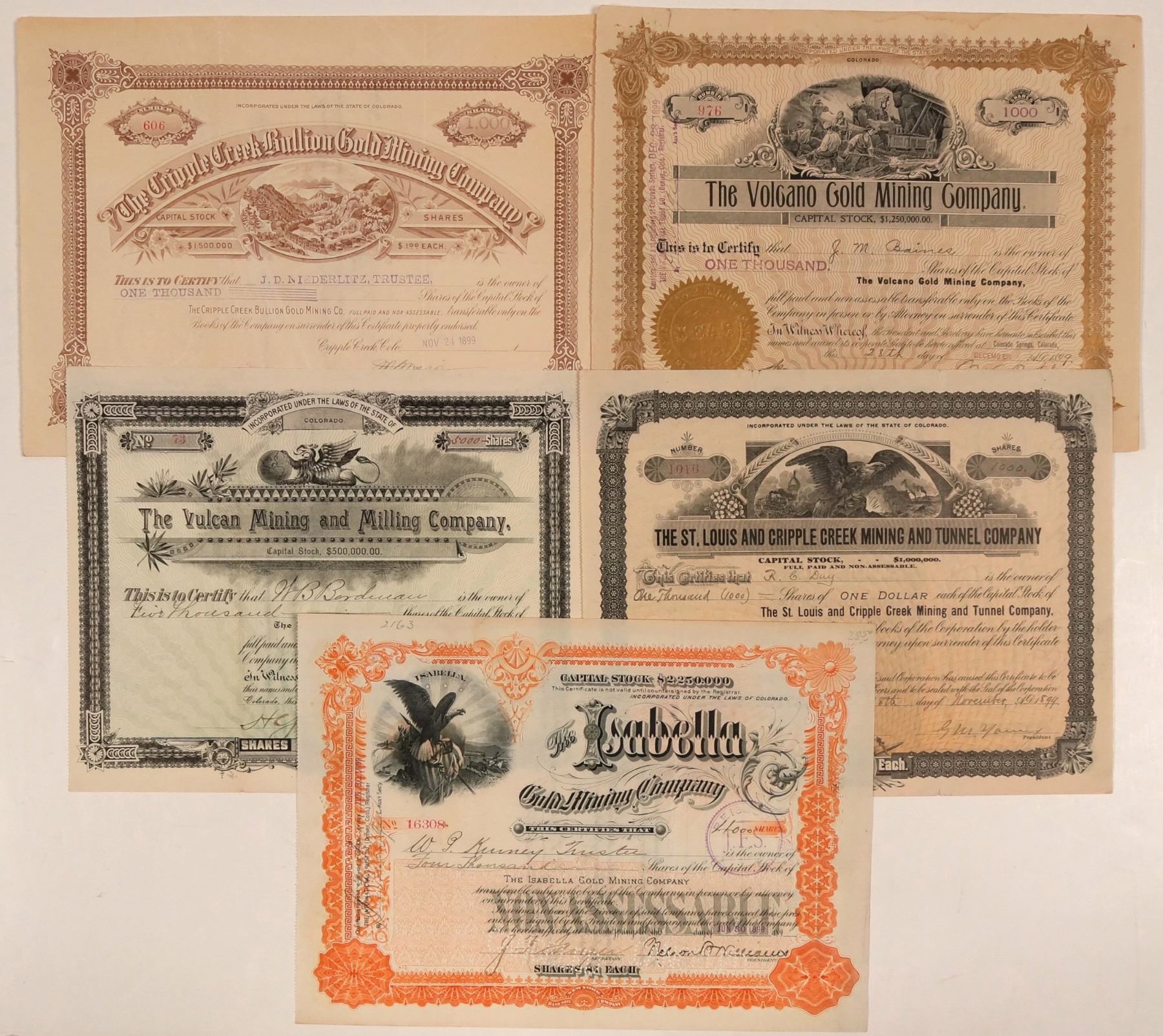 Lot of 5 different. Includes: Cripple Creek Bullion Gold Mining Company (1899, mining vignette); St. Louis & Cripple Creek Mining & Tunnel Company (1899, eagle vignette); Isabella Gold Mining Company (1898, eagle vignette); Volcano Gold Mining Company (1899, mining vignette); and the Vulcan Mining & Milling Company (1895, allegorical vignette).