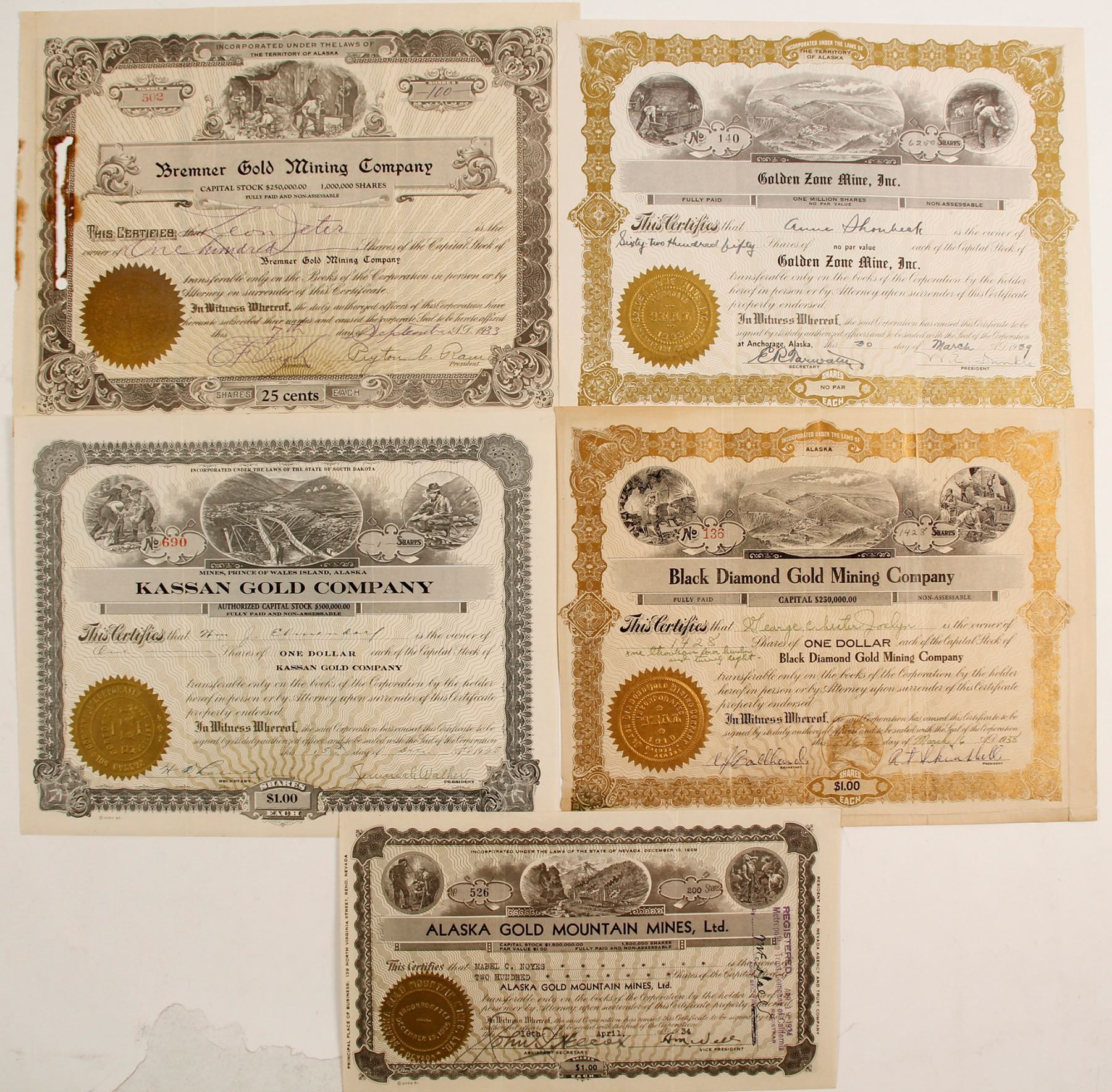 1) Kassan Gold. # 690. 1925. Placer mining vignette. Two vertical folds. No other issues. 2) Bremmer Gold. # 502. 1933. Underground mining vignette. Left side has some fire damage. 3) Alaska Gold Mountain Mines. # 526. 1924. Three mining and milling vignettes. Slight crease bottom left. 4) Black Diamond Gold. # 136. 1938. Two underground mining vignettes and one mountain valley vignette. Bottom border has issues. 5) Golden Zone , Territory of Alaska. # 40. 1939. Two underground mining vignettes and one mountain valley vignette. Nicks at fold edges. No other issues. Prag Collection