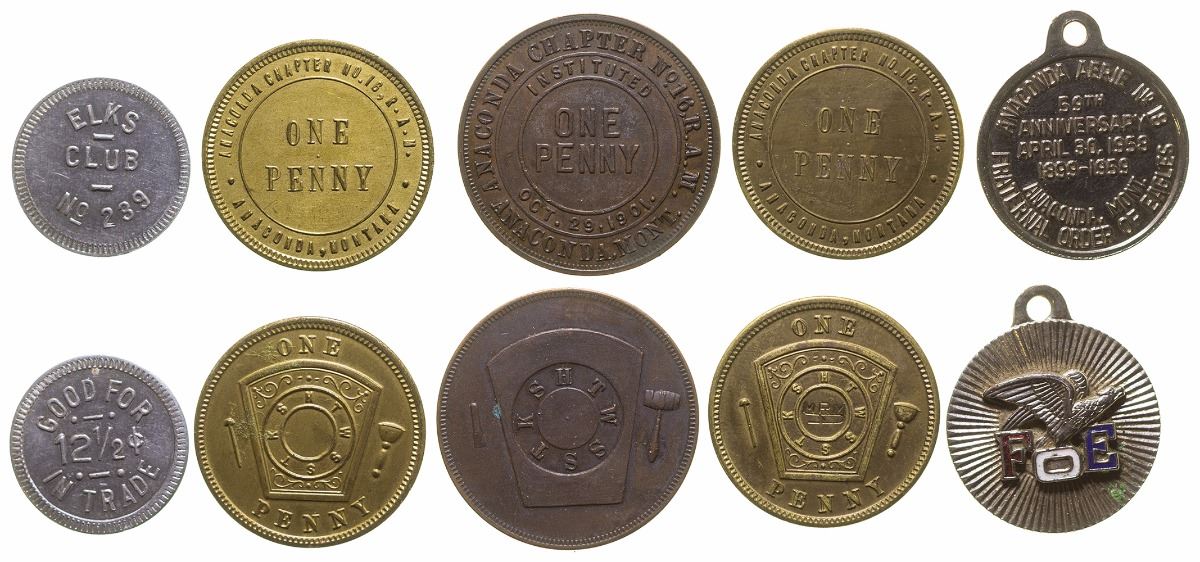 Lot includes: 2 Anaconda chapter no. 16, RAM; one larger Anaconda chapter no. 16, RAM; Elks club no. 239, GR / 12-1/2c / IT, round, aluminum; Anaconda aerie no. 18, 59th anniversary, 1958, raised image of eagle on one side. State: Montana City: Anaconda Date: FHWAC#: 41634