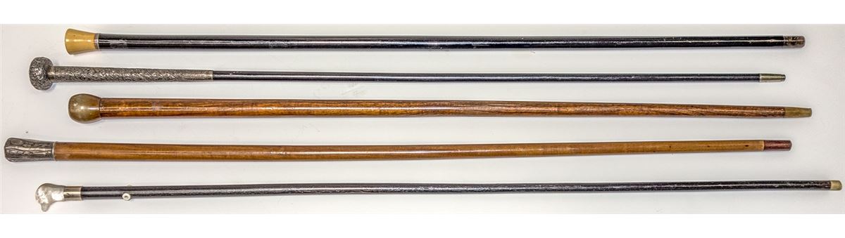 Very nice collection. 1) Silver on top, beautifully hand engraved, plus silver tip. Dark wood. 2) Lighter wood, darker tip with hand engraved (more modern design) silver top. 3) Mother of Pearl, top in form of duck, silver on neck. Dark wood, white tip. 4) dark brown wood cane with lighter top and sterling band. 5)Medium brown wood cane with shell top and tip.