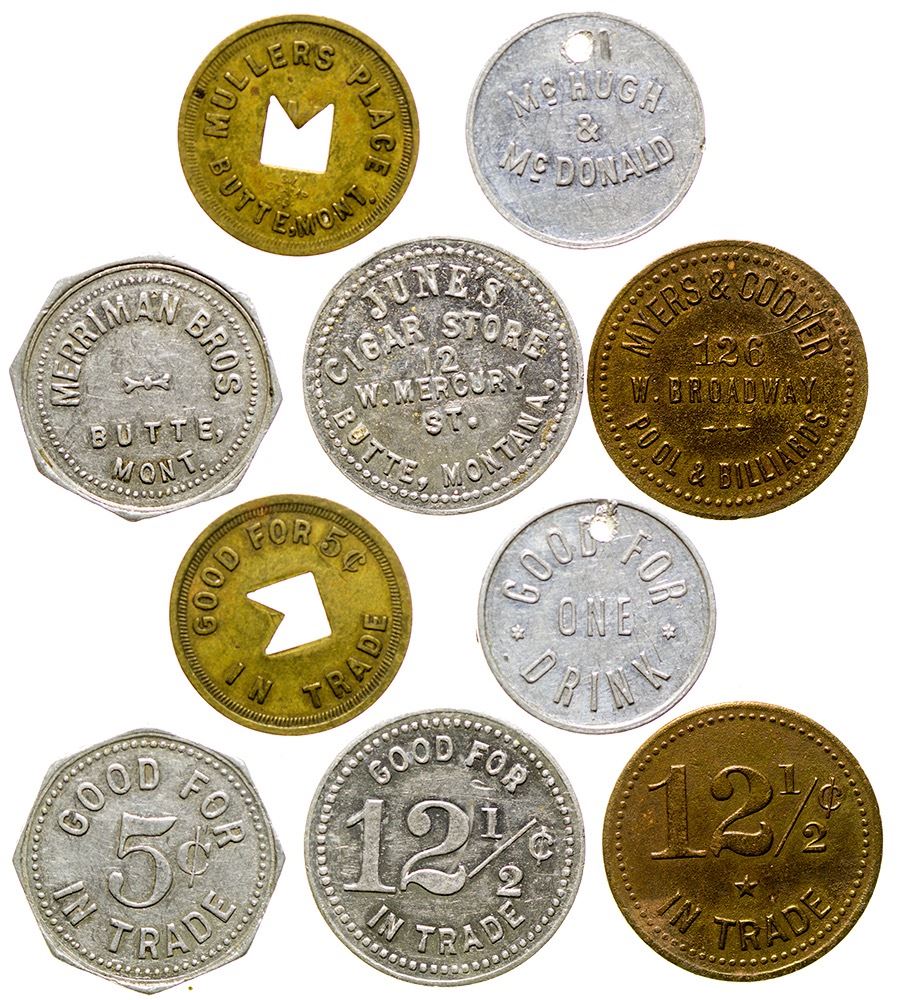 1) June's Cigar Store // GF 12-1/2c / IT. 2) Myers & Cooper // GF / 12-1/2c / IT. 3) Mullers Place // GF / 5c / IT. "M" shaped cut-out. 4) Merriman Bros. // GF / 5c / IT. 5) McHugh & McDonald / GF / One / Drink. (Svoboda Collection) City: Butte State: Montana Date: HWAC# 35800