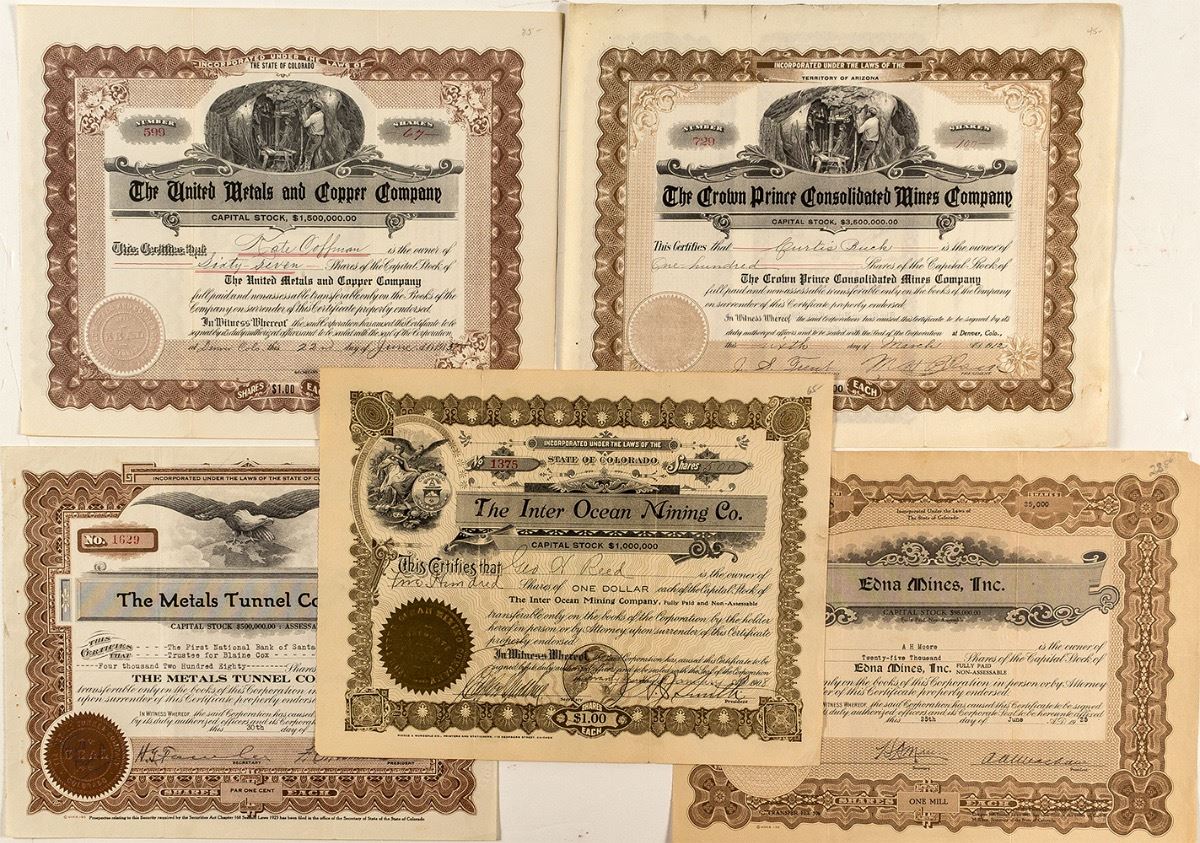 Includes: The Inter Ocean Mining Co. (1908, not cancelled, allegorical vignette), Edna Mines Inc. (1925, not cancelled), The Metals Tunnel Company (1933, pen cancelled, eagle vignette), The United Metals and Copper Company (1915, not cancelled, vignette of miners using drill), and The Crown Prince Consolidated Mines Company (1912, not cancelled, same vignette as previous). Overall condition is good with folds and minor separation. (Prag Collection) City: State: Colorado Date: 1908-1933 hwac# 34241