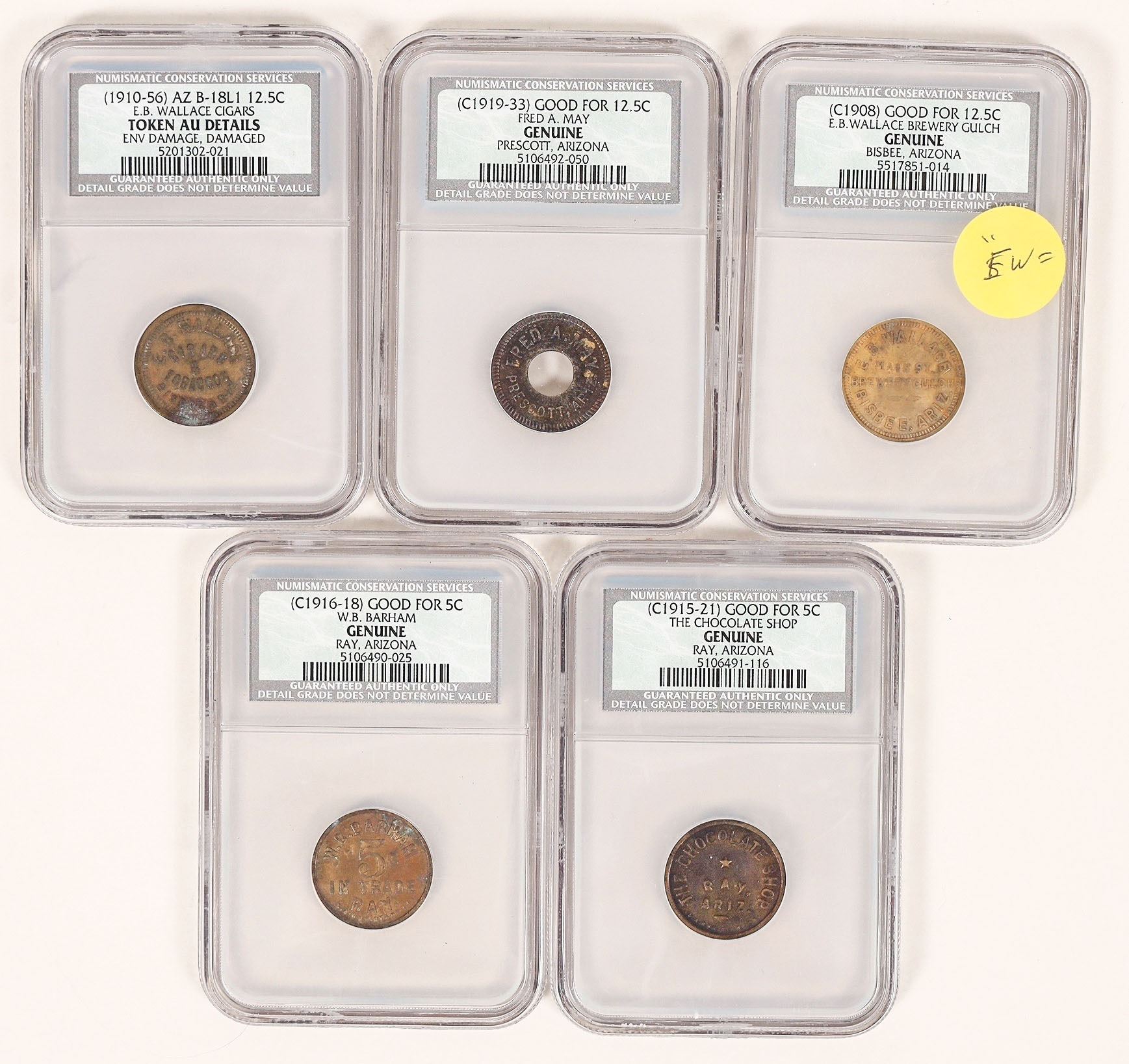 Lot of five Arizona tokens Numismatic Conservation Services certified as Genuine: 1) W. B. Barham, Ray; GF 5c; 2) The Chocolate Shop, Ray; GF 5c; 3) E. B. Wallace Cigars, Bisbee, GF 12.5c; 4) Fred A. May, Prescott, GF 12.5c; 5) E. B. Wallace Brewery Gulch, Bisbee, counter stamped "E. W." GF 12.5c.