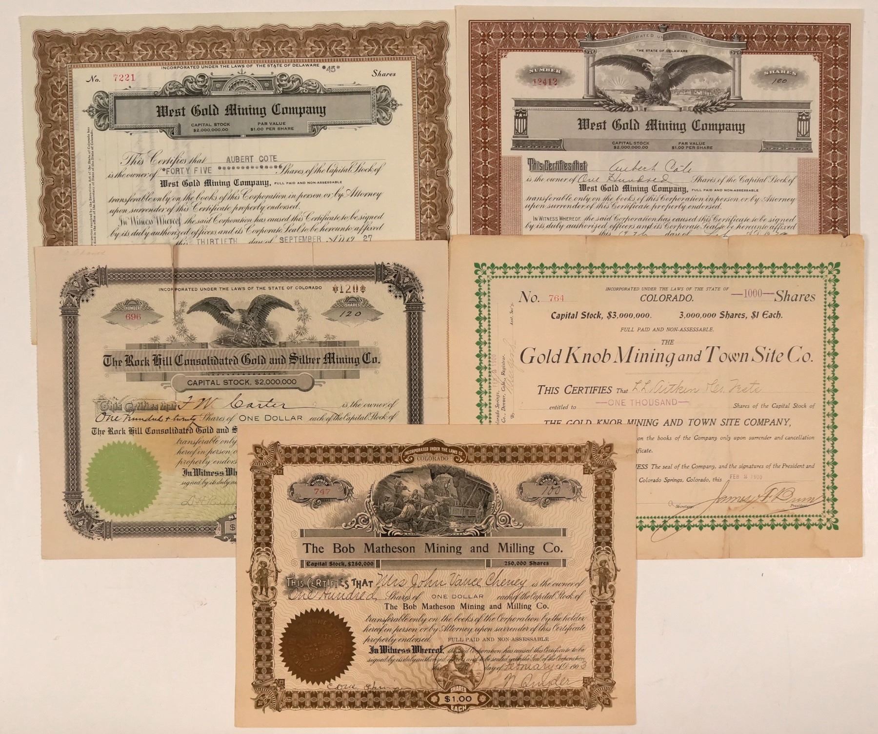 Lot of 5 different. Included: The Bob Matheson Mining & Milling Company (Springer, 1903, mining vignette, not cxl); Gold Knob Mining & Town Site Co. (1900, not cxl); The Rock Hill Consolidated Gold & Silver Mining Co. (1906, eagle vignette); and West Gold Mining Company (Colorado City, two different, 1927, 1929, one with eagle vignette). Some have condition issues; please inspect. State: Colorado City: El Paso County Date: 1900-1929