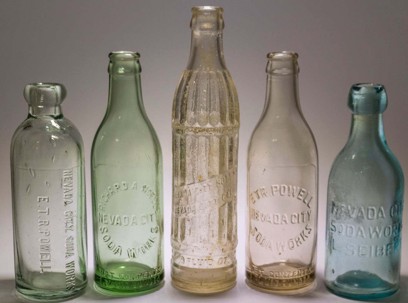 Light green NEVADA CITY SODA WORKS / E.T.R. POWELL. Lime RICHARD A NOELL / NEVADA CITY / SODA WORKS / NET CONTENTS / 8 FLUID OUNCES. Clear E.T.R. POWELL / NEVADA CITY / SODA WORKS / NET CONTENTS / 8 FLUID OUNCES. Bottom reads DIPCCO. Lip chip. 4 small bruises. Aqua, NEVADA CITY / SODA WORKS / L. SEIBERT. Clear NEVADA CITY BOTT WKS. NEVADA CITY CALIF. / 9 FLUID OZ. // CITRIC ACID ADDED / ARTIFICIAL / COLOR FLAVOR. Some wear on shoulder edge. City: Nevada City State: California Date: HWAC# 51422