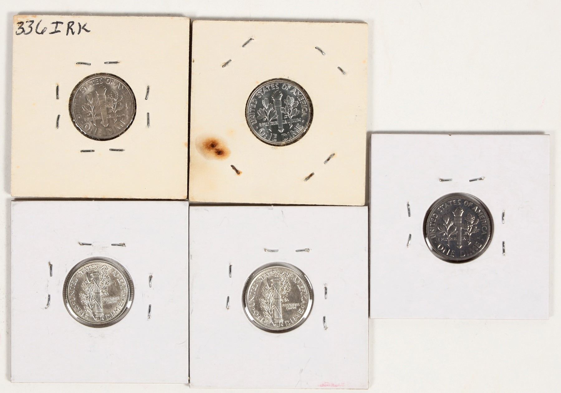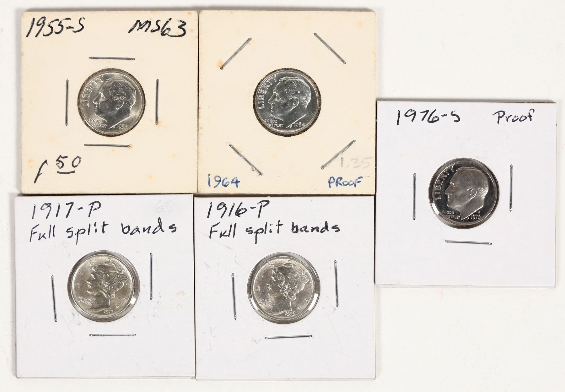 Two Mercury and three Roosevelt outstanding condition dimes: 1) 1916-P full split bands Mercury, BU; 2) 1917-P full split bands Mercury, BU; 3) 1955-S Roosevelt, BU; 4) 1964 Roosevelt, proof; 5) 1976-S Roosevelt, proof.