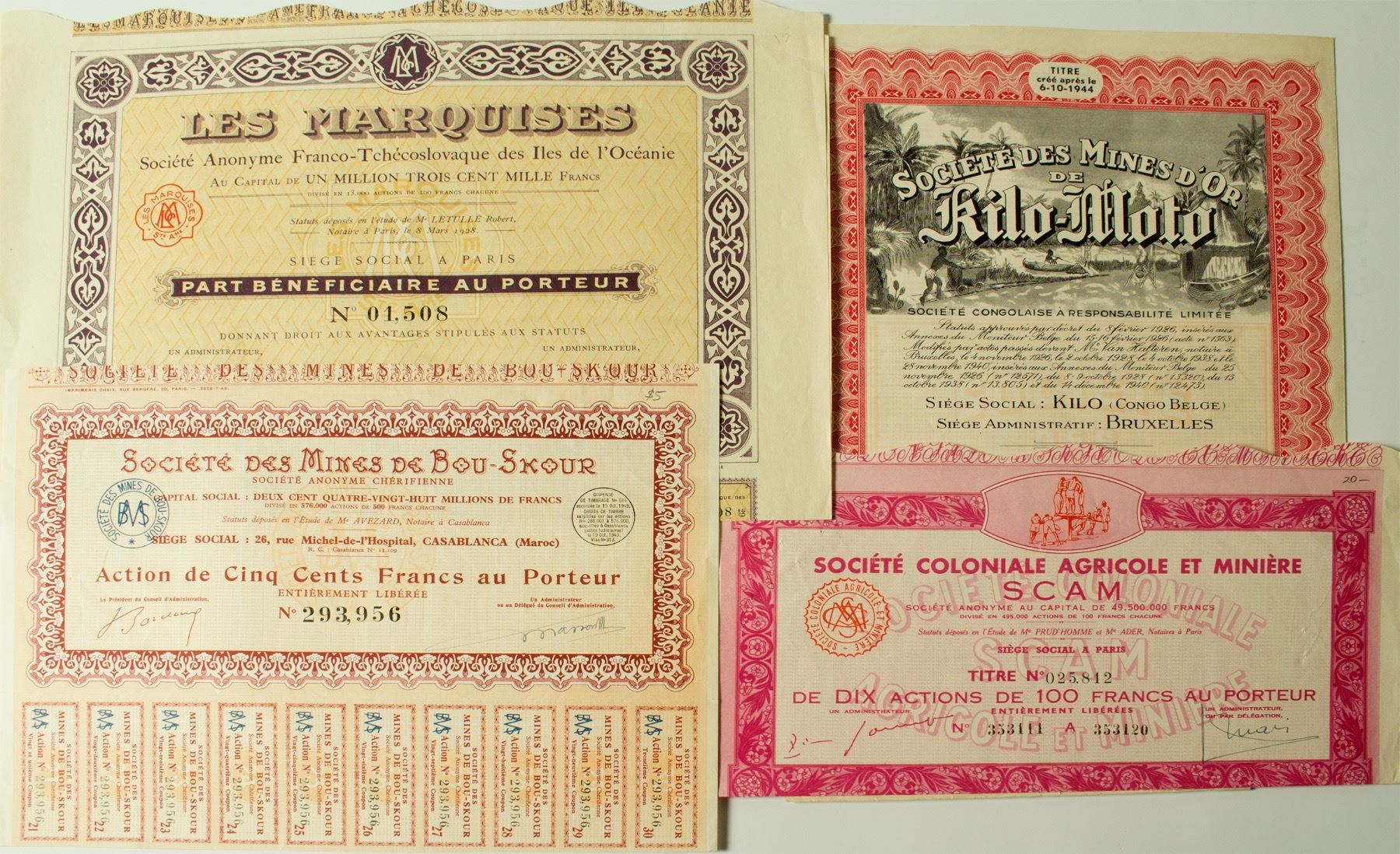 Societe des Mines de Bou-Skour, Casablanca; Societe Coloniale Agricole et Mineire, Paris; Les Marquises, 1928; Charbonnages Reunis du Nord Donetz a Marievka, 1906; Societe des Mines d'Or de Kilo Moto, c1928 (torn corner), Belgian Congo. State: Foreign City: HWAC#: 47851 Date: