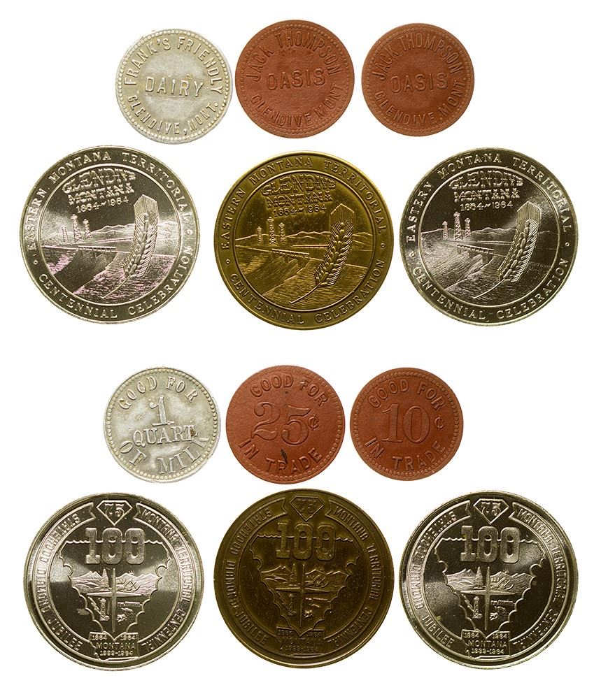 1) Frank'd Friendly Dairy. 2) Three tokens: Glendive territorial Centennial 1864-1964. 3) Two tokens: Jack Thompson Oasis //GF / 10c, 25c / IT. (Svoboda Collection) City: Glendive State: Montana Date: HWAC# 35823
