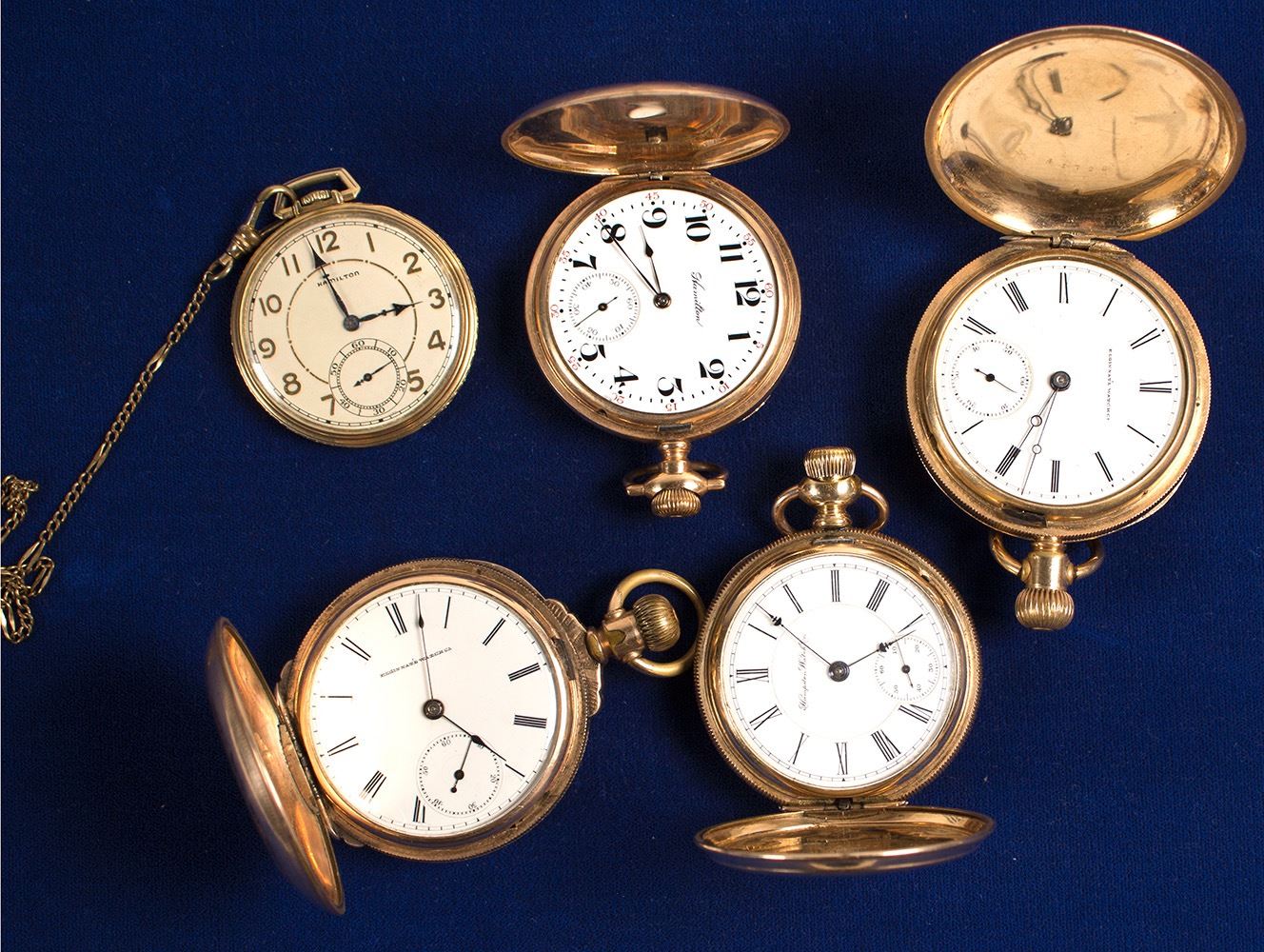 Five gold pocket watches, all presently not working. 1) Hamilton (no glass) Crescent case, prob gold plated, 17 jewels, sn763985, 2" diam; 2) Elgin Natl, sn 1305528, prob gold plated, 2.15" diam, some case damage; 3) Elgin Natl, HH Taylor works, sn886600, poss gold plated. 2.15" diam; 4) Hampden, Deuber case with full label!, gold filled, 17 jewels, sn993803 (1896) 5)Hamilton w gold watch chain. Date: Location: HWAC# 56023