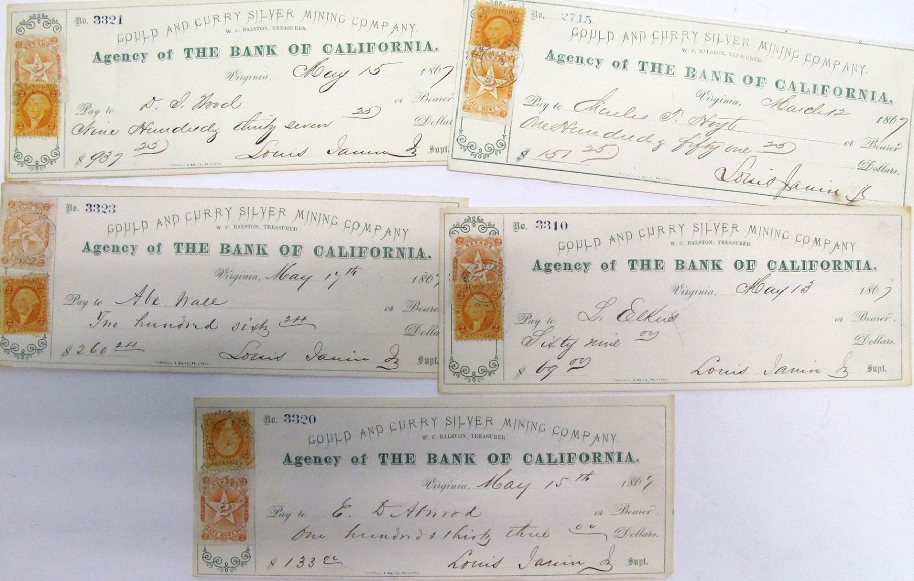 All five are issued in 1867 and signed by Louis Janin Jr. as superintendent. This is the rare "dripping letters" style Gould & Curry check (see the logo) that also lists W.C. Ralston as the treasurer. Each check has Nevada and IR adhesive revenue stamps. Cut cancel. Clean. Date: 1867 Location: Virginia City, Nevada HWAC# 63994
