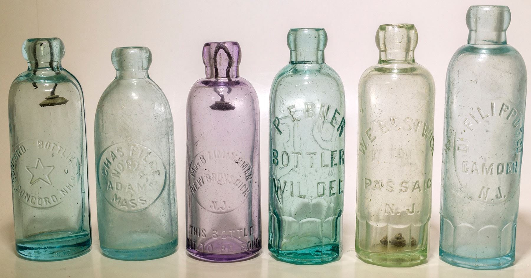 Five Hutch soda bottles. Fiege from North Adams, Massachusetts. Ettinger from Delaware. Concord from Concord, New Hampshire. Filippo from Camden. Zimmerman from New Brunswick, New Jersey. All aqua except the last one which is purple. Also Bostwick from Passaic New Jersey. Nice group, near mint. HWAC# 47039 Date: Location: Massachusetts/Delaware/New Hampshire/New Jersey
