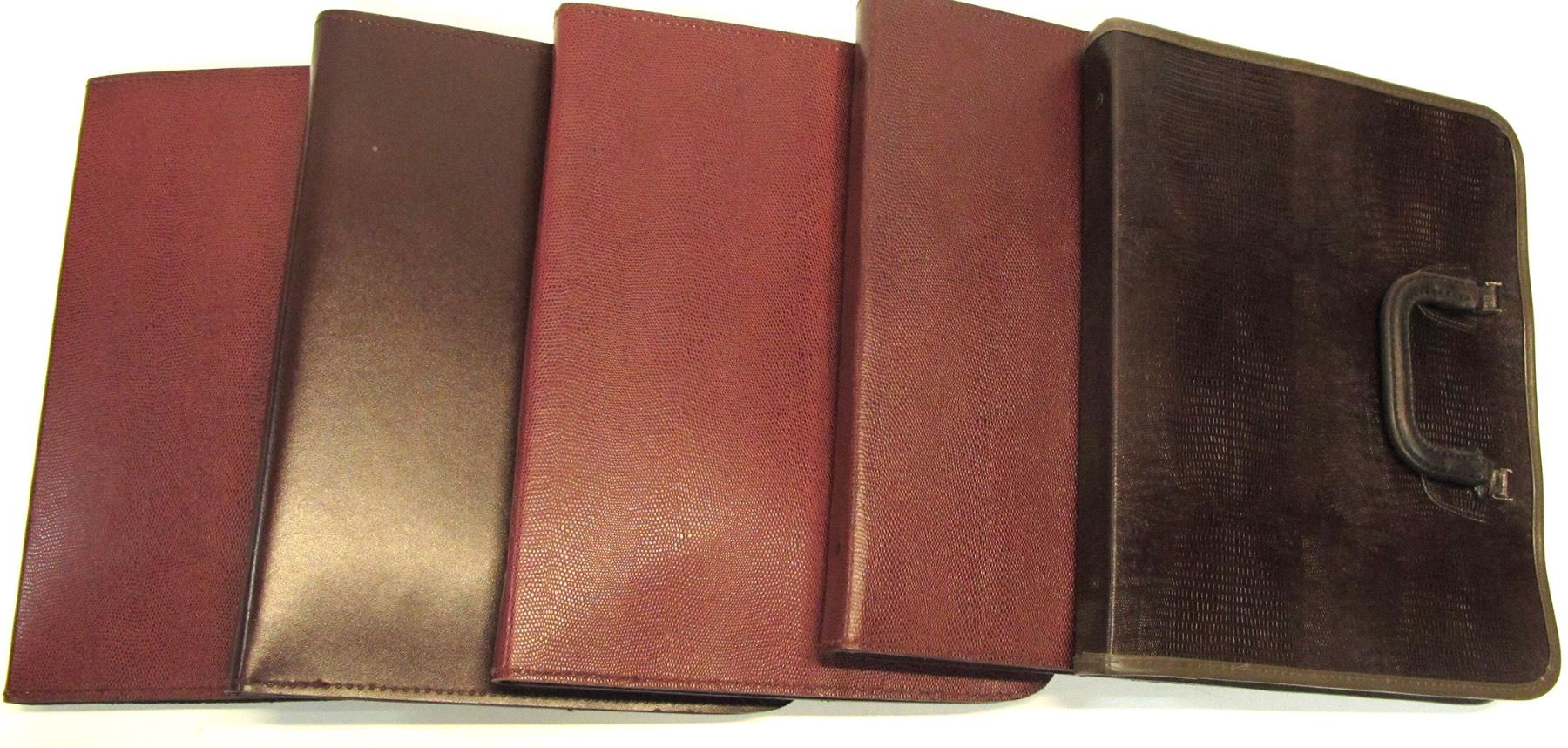 Five new red/brown leather folio holders with zipper closure and carrying handles. Made by NSM Industries, 17 x 13, holds the standard black paper/plastic holders. Date: Location: HWAC# 57222
