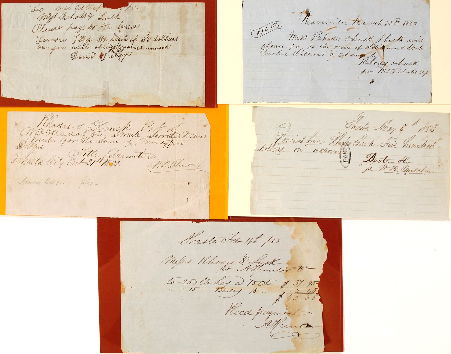 Five notes. 1) 1852 Sacramento. To Rhodes & Lusk. Pay bearer $55.00. David Delap. 2) 1853 Weaverville. Pay to the order of Skillman & Dosh "$12 & charge to Rhodes & Lusk. 3) 1853 Shasta. "Received from Rhodes & Lusk Five Hundred Dollars on account." Oval 'PAID' stamp. 4) 1853 Shasta. Transport 253 pounds of hay. 5) Rhodes & Lusk bought one male mule for $95. October 31, 1852. Rhodes and Lusk's Express operated from 1852 to 1854 and conveyed "treasure, letters and other packages" from San Francisco in the south, to Jacksonville, Oregon Territory in the north. California offices between the northern and southern points were located in Sacramento, Colusa, Shasta City, Weaverville, and Yreka.(Potter Collection) State: California City: Sacramento City Date: 1852-1853 HWAC# 56066