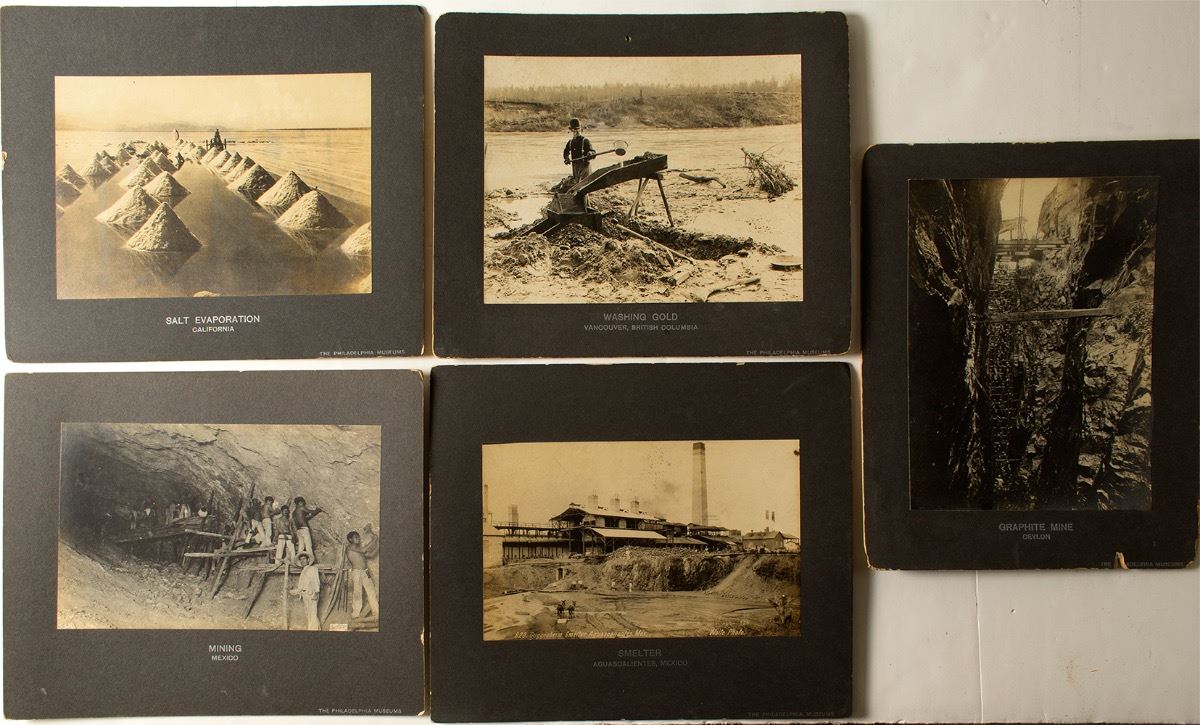 Philadelphia Museums Mining Cabinet Cards. 1) Washing Gold, Vancouver, British Columbia. 2) Guggenheim Smelter, Aguascalientes, Mexico. 3) Sirena Mine underground mining scene, Guanajuato, Mexico. 4) Salt Evaporation, southern California. 5) Graphite Mine, Ceylon. All are 7" x 9", mounted on 9.75" x 11.75" boards. City: Philadelphia State: Pennsylvania Date: hwac# 35469