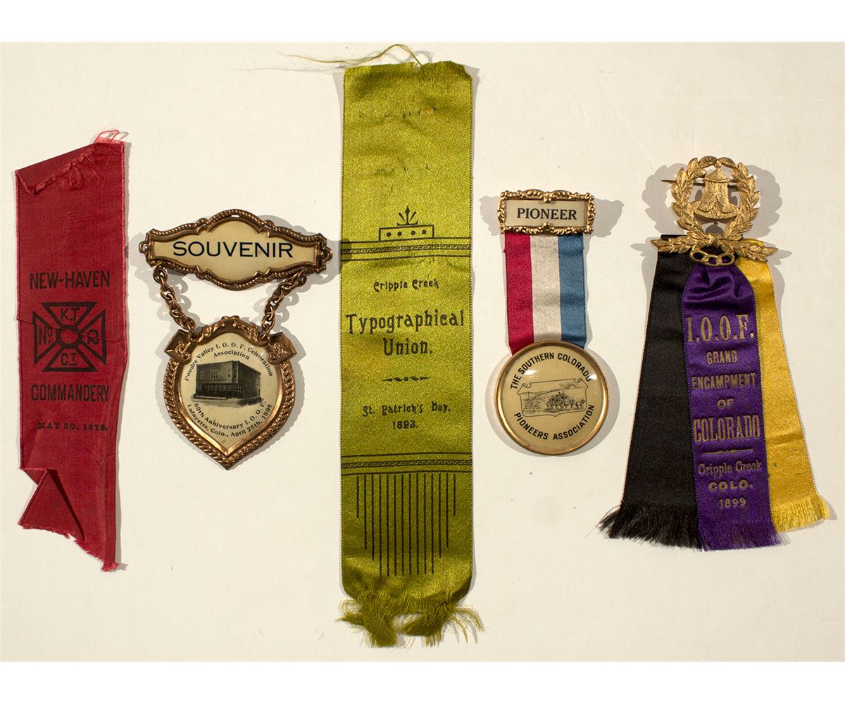 1) Green silk ribbon for the Cripple Creek Typographical Union for St. Patrick's Day, 1893. 8" x 2" with frayed edges. 2) An 1899 Cripple Creek IOOF badge with three colored (purple, black, and gold) ribbons attached. Made by The M.C. Lilley & Co. (Columbus, Ohio). Badge features bell and wreaths. 1.75" x 2." Ribbons are 4.25" x 1" Very good condition. 3) May 30, 1872 Knights Templar ribbon for New-Haven Commandery. 6.75" x 1.75" with creases and frayed edges. 4) Badge for The Southern Colorado Pioneers Association. Manufactured by Whitehead & Hoag Co. Badges, patent June 12, 1894. Two celluloid pieces connected by a red, white, and blue ribbon. Top piece says "PIONEER," bottom has the association name plus vignette of stagecoach next to train tracks (1.75" diameter). 5) Souvenir badge for the Poudre Valley I.O.O.F. Celebration Association 89th Anniversary in Lafayette, Colo., April 25th, 1908. Two celluloid pieces attached by brass chain. Top piece says "SOUVENIR" and bottom has information along with vignette of building. 4" x 3"