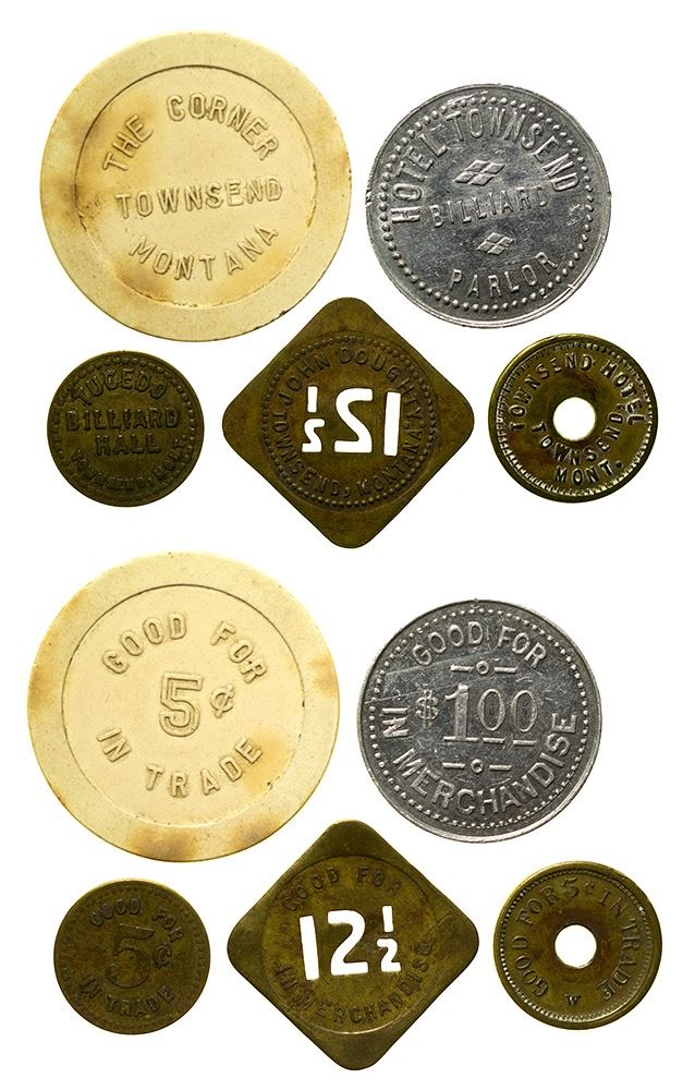 1) John Doughty. Square, set in diamond shape, brass, cut-out for 12-1/2. 2) Townsend Hotel. Round, brass, cent hole. 3) Tucedo Billiard Hall. Round, brass. 4) Hotel Townsend Billiard. Round, aluminum. 5) The Corner. Round, plastic or wood. (Svoboda Collection) City: Townsend State: Montana Date: HWAC# 35849