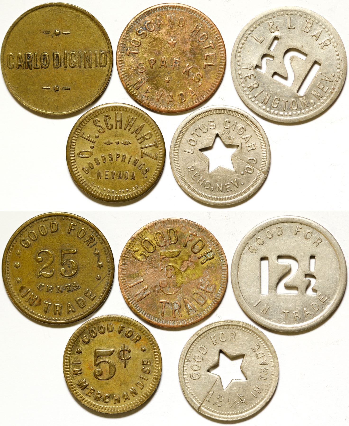 Lot of five: L & L Bar, Yerington, GF 12 1/2 (cutout); Carlo Diginio, Moundhouse (25c the rare denomination); O.F. Schwartz, Goodsprings; Lotus Cigar Co., Reno, (cutout star); Toscano Hotel, Sparks. State: Nevada City: Date: HWAC# 84323