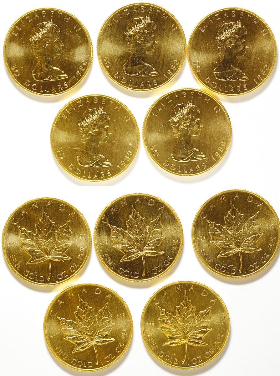 Lot of five 1 Troy Ounce 1980 Canadian Gold Maple Leaf coins, uncirculated, 999 Fine Date: Location: Canada HWAC# 75942